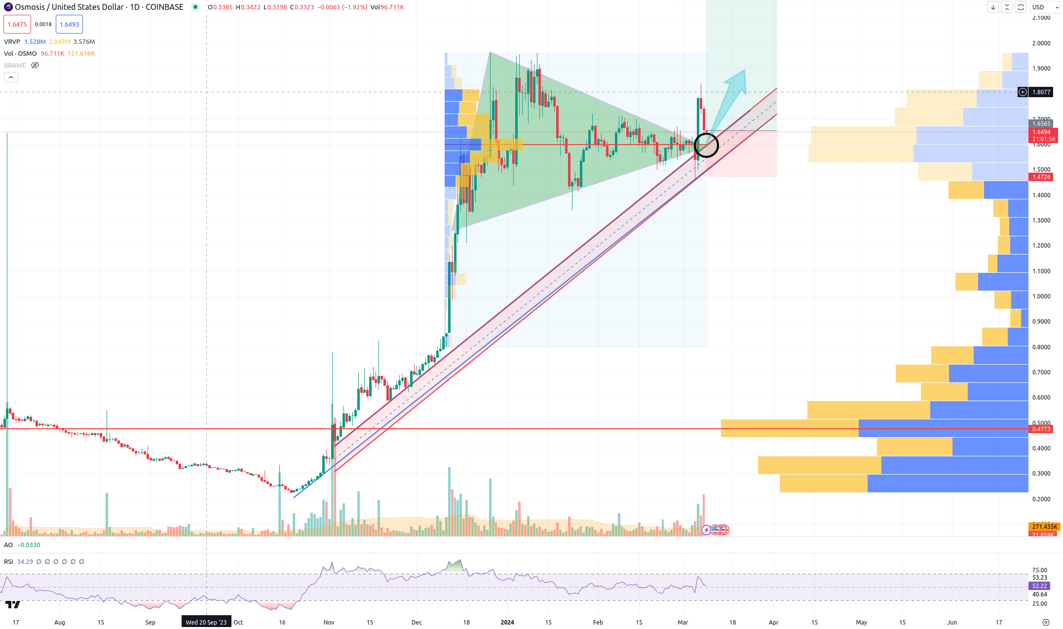 Osmo (chart below) looks to be landing on good support. Again, as I posted previously, not only do we have all my indicators flashing green, but we also have good volume support intersecting with ascending channel support. It should do well if Bitcoin can hold up a little longer. Obviously, I am banking that it will.