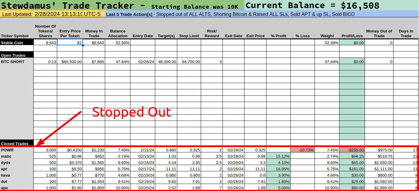 I was stopped out of all of my altcoins during the volatility of the past hour and a half. Out of the 7 coins that sold on me, 6 ended up in nice profit. There was one straggler which I will admit I was too early on entry into. That last coin was POWR. The 6 winners were: MATIC, DYDX, APT, KAVA, DOT, and APE.