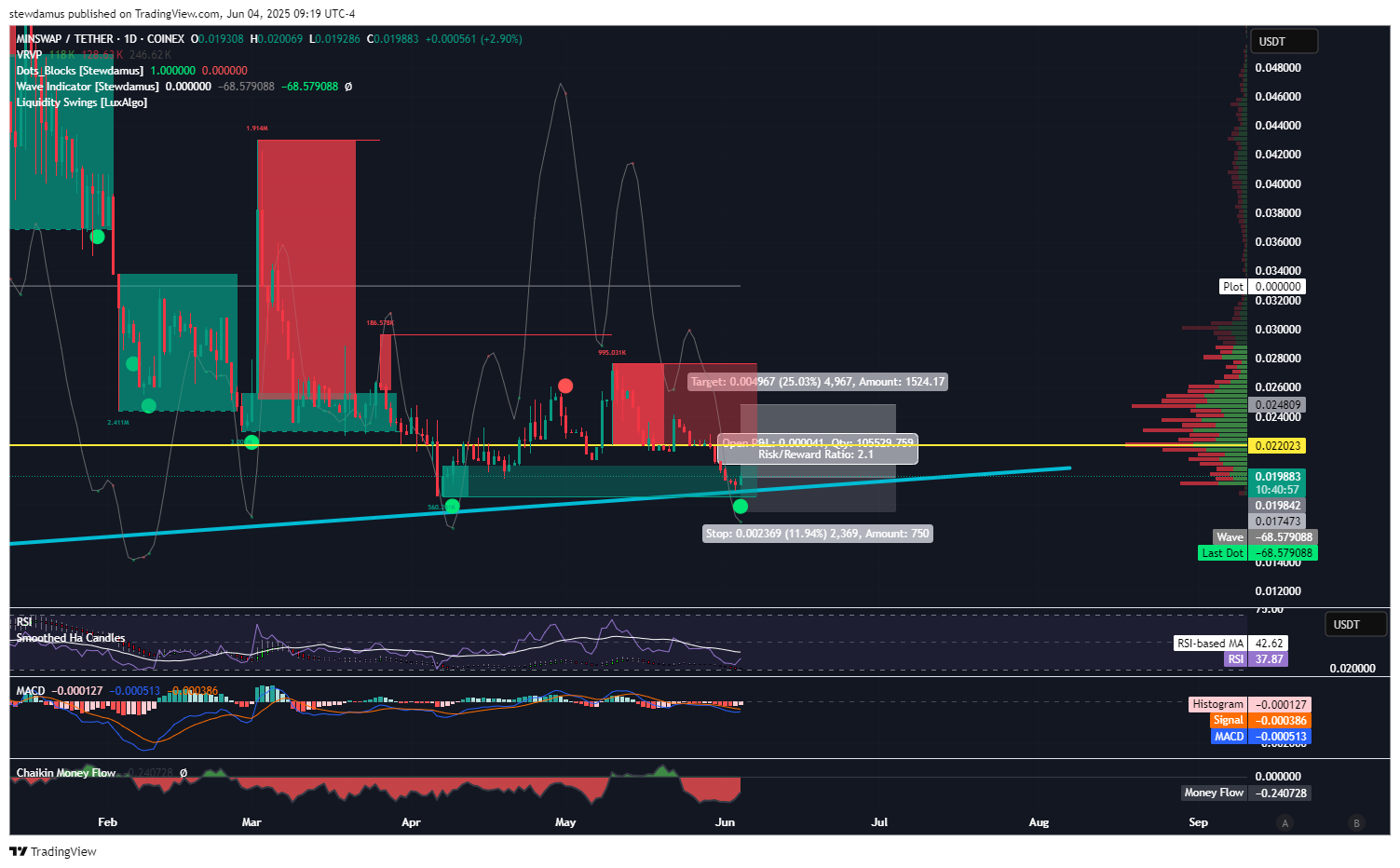 On the MINSWAP trade, we’re looking at the daily. We’re also inside a nice liquidity block here and on solid support. I will target a nice conservative 25% profit for this trade.