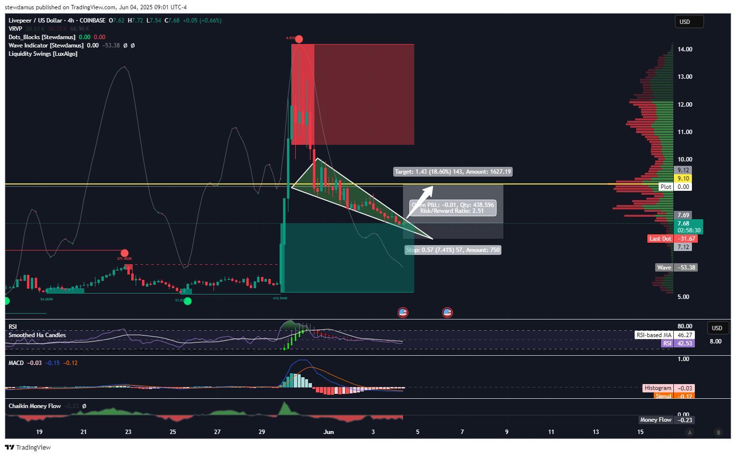 So, this first trade is looking at a 4 hour chart. This will be a quicker trade which I normally don’t do here. But what the hell. Let’s give it a shot. You can see that we’re about to break out of that bullish descending wedge. We’ve got a nice green liquidity block beneath us and are oversold by most indicators. The VRVP shows us a good PoC at around $9.10. That will be my target for this trade.