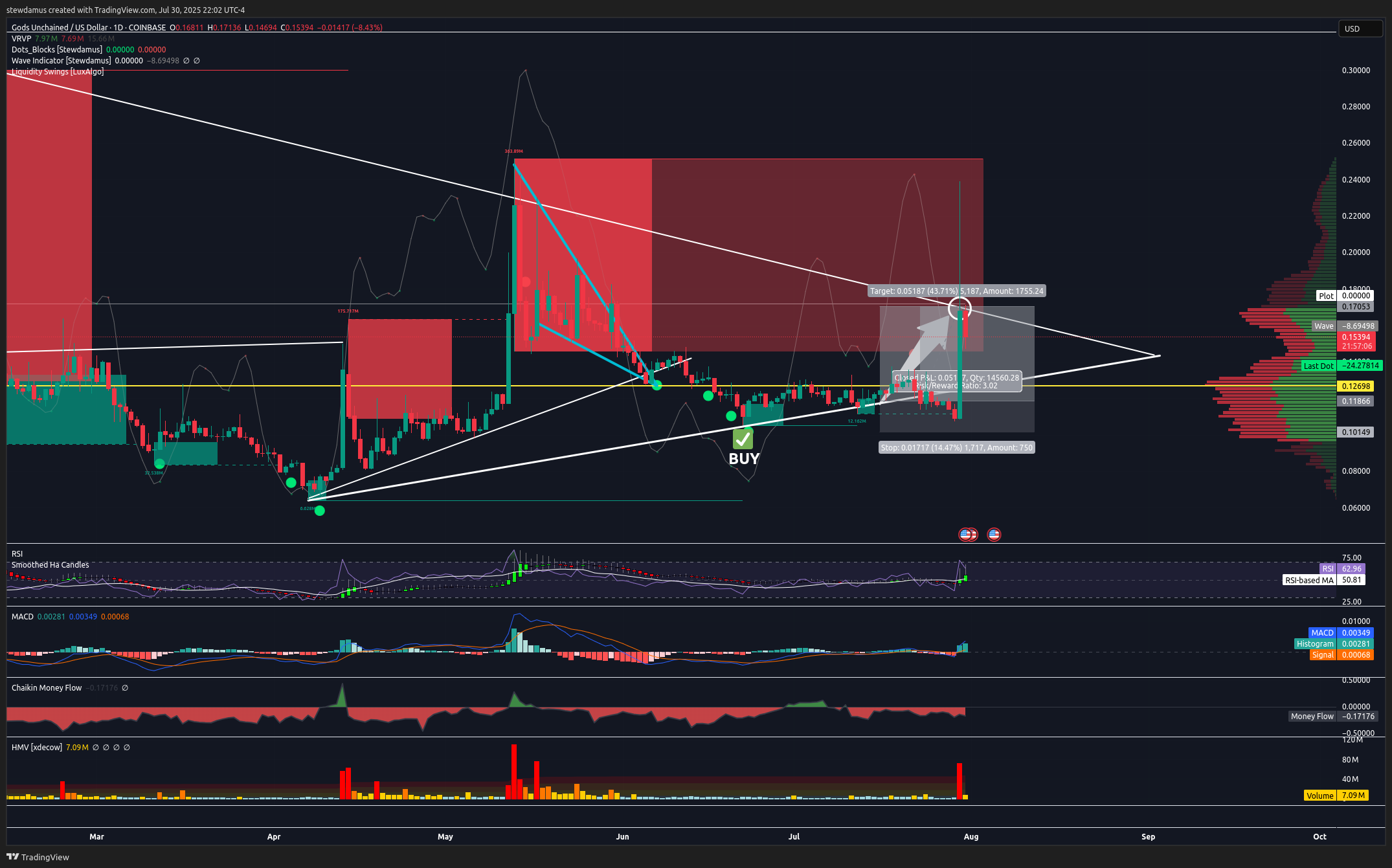 Trade AlertsSold GODS for 43% Profit#gods #altcoin #memecoin #trader #cryptoStewdamusJul 31, 2025ShareGood Evening Traders,Tonight we reached, and quickly exceeded, our target of 17 cents on GODS where my sell order was placed for a healthy 43% profit. ✌️StewPreviousNext