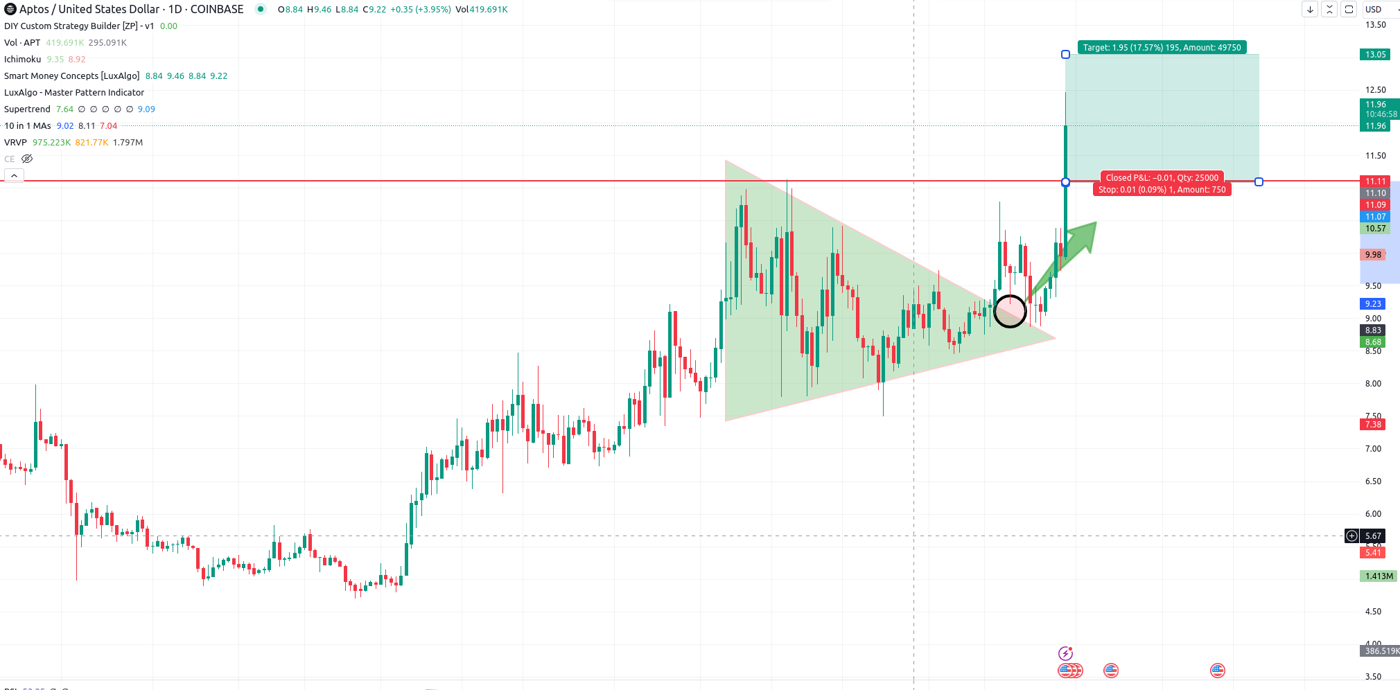 So far, my proprietary blend of indicators has been working out very nicely. We are not batting 100%, but we are very close to perfect with 24 of the last 25 trades sold for profit. I will continue to utilize my confirmation system, configure, and work on our issues if/when I run into them. At times, I doubt when the system gives me green signals. Such was the case with Aptos. But with patience, we were able to see another 25%+ profit on the first half of our trade entry here. For the remaining half, I will let ride for a bit longer. I have raised my stop to our final target price of $11.11 and will have at least 17% profits locked in on that entry.