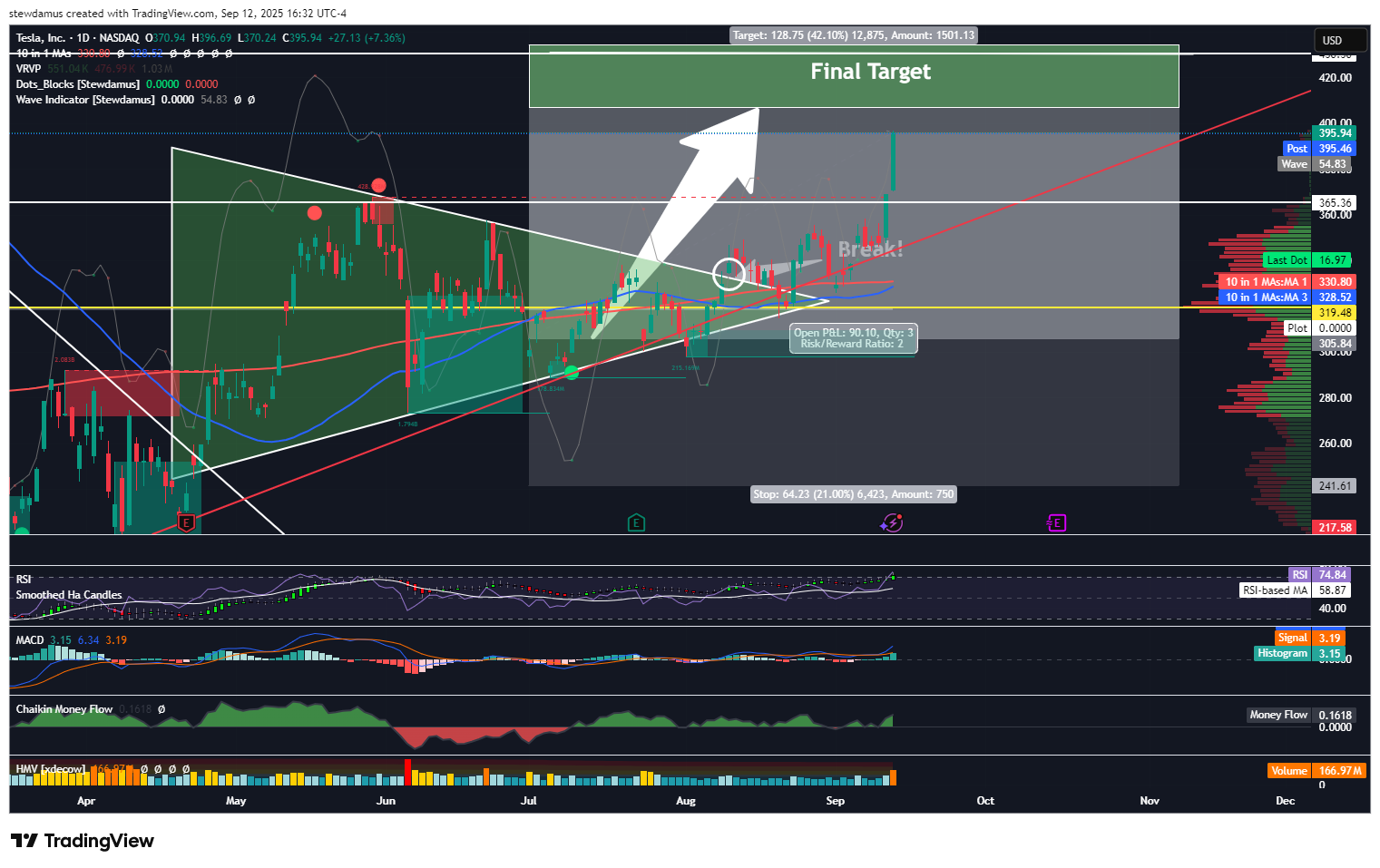 My indicator wins again. We have almost reached our target on TSLA 0.00%↑ and so, just before market close, I unloaded half of my position for a solid 30% profit, raising the stop to $365. I will leave the rest of my position ride until I get a sell signal or my SL is triggered, whichever comes first.