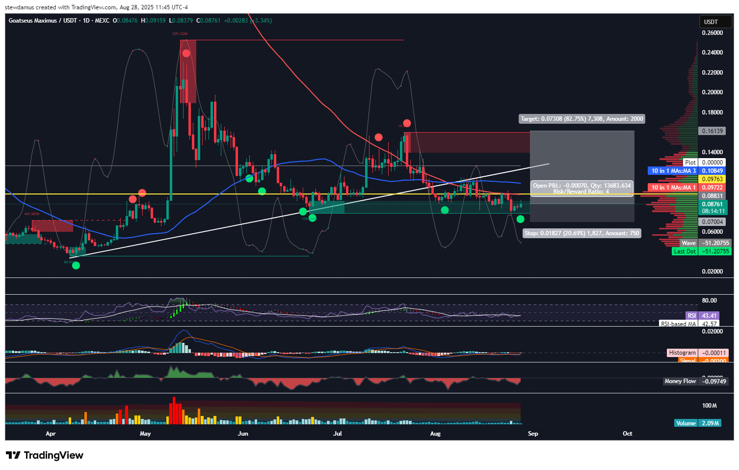 The second coin is Goatseus Maximus. Check out that long accumulation period. Bullish. Additionally, another signal to buy from my indicator. I will be a bit more aggressive on this one with a 1:4 rrr, targeting around .16 cents and stopping out at around .07. On this one, I may sell half a little earlier. Once we reach that ascending trendline, I will be watching price action closely.