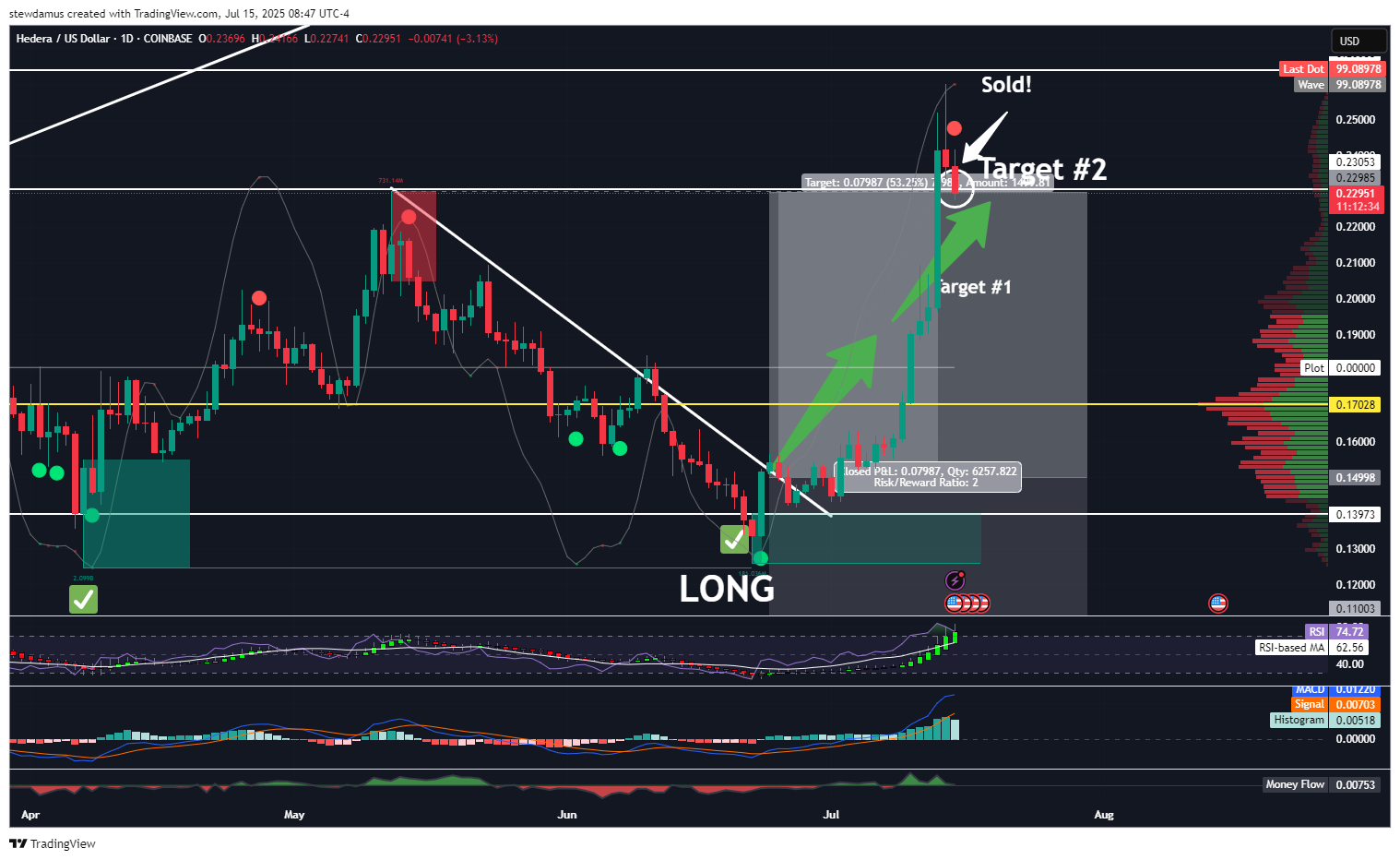 As mentioned yesterday, HBAR reached and exceeded our Target #2. Consequently, I moved my SL up to this level and let the remainder of our position ride. If we had tagged that level above us (.264), I might have sold the remainder. We almost hit it, but came just shy. Now, we have returned to my target (SL) and I have been stopped out with a 55% profit to show. I will begin searching for a new position and will post it here once I find one.