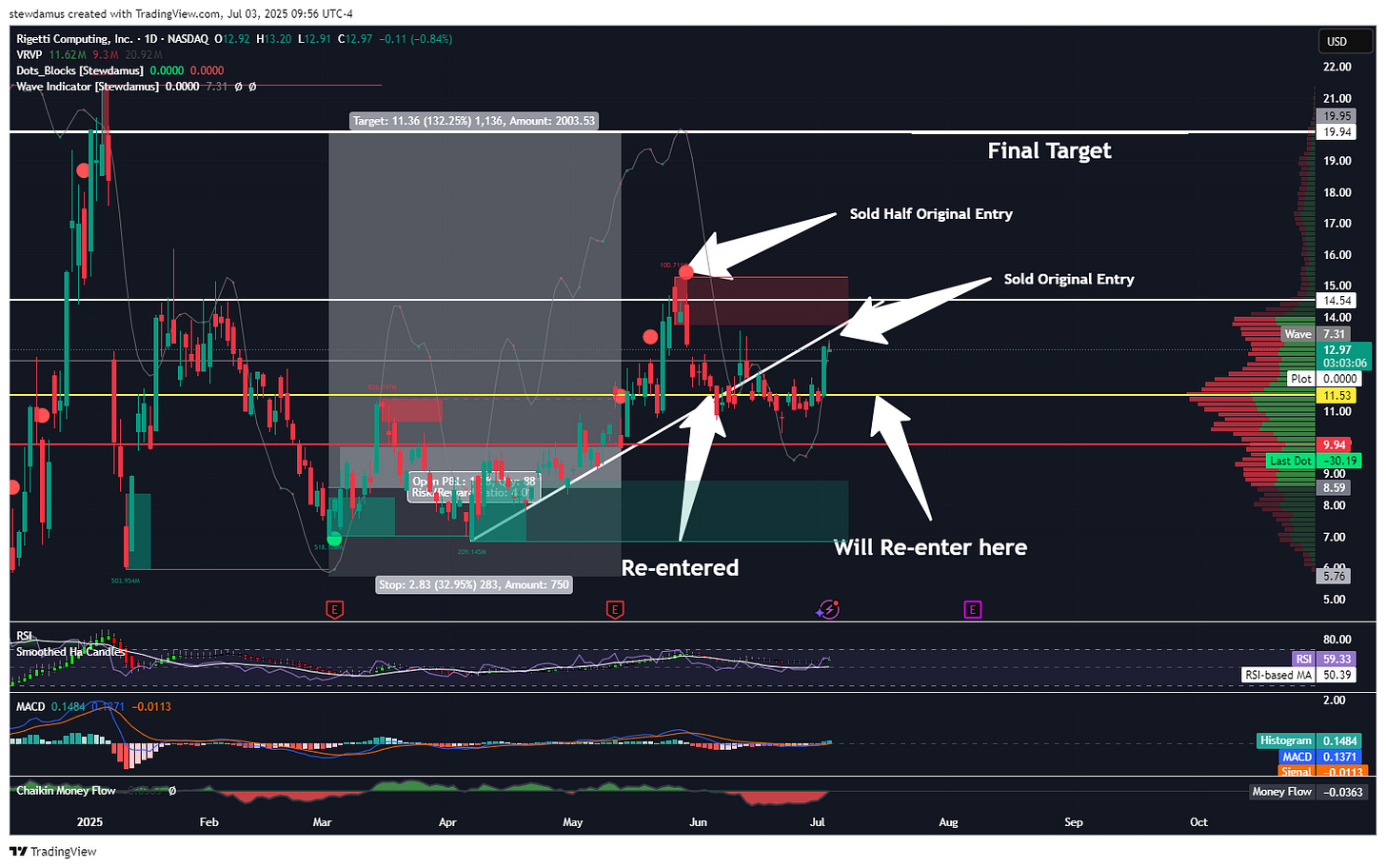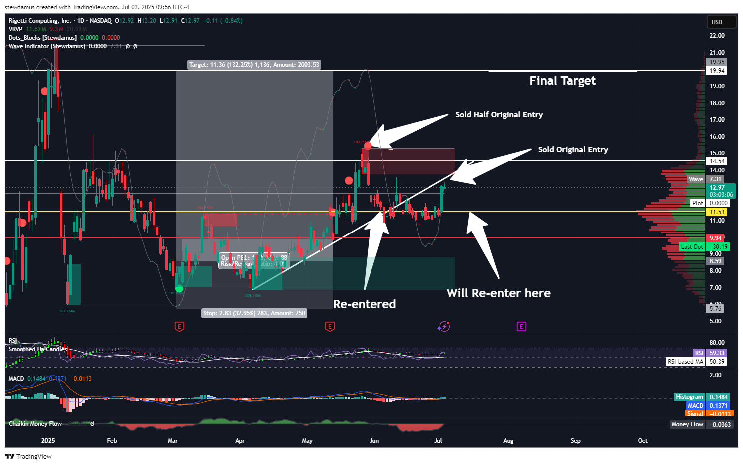 Today, I have decided to sell RGTI at 53% profit on my original entry, taking yet another big win. I have another half still in play and in the money from my re-entry. I will look to re-enter even more should we come back down to a price of $11.50 or lower.