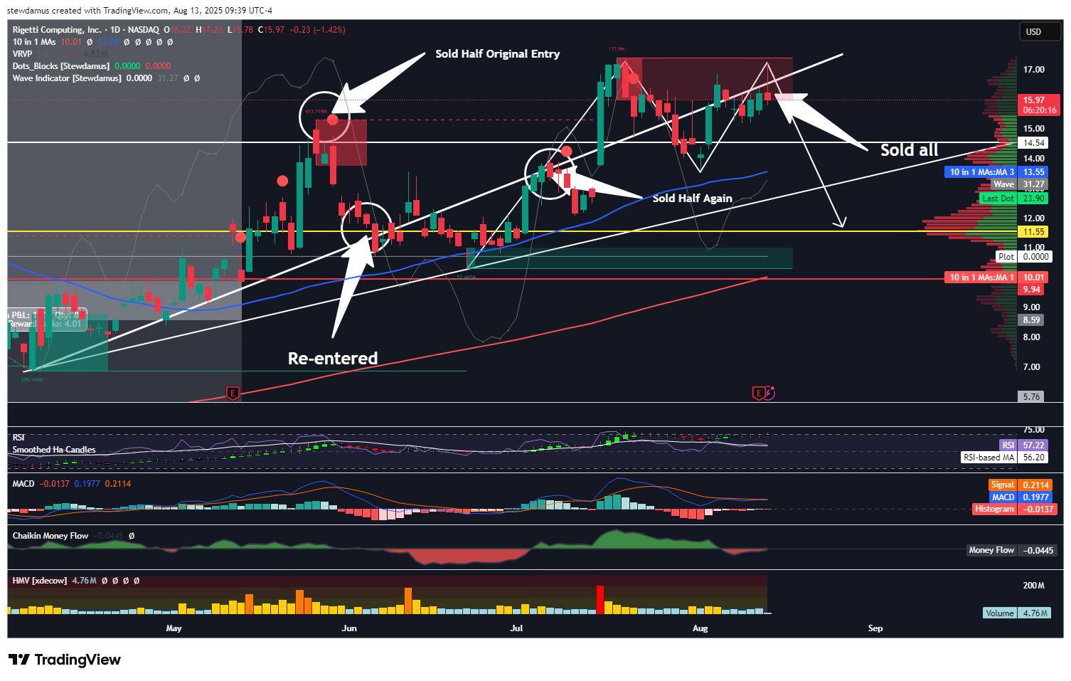 Trade AlertsSold RGTI For 42% Profit#rgti #stocks #traderStewdamusAug 13, 2025ShareTrading Fam,Not going to push my luck on this trade. We entered a large sell-side liquidity block on negative news (larger losses than expected) and a double-top pattern. I’ve decided to sell here and take my 42% profit.✌️Stewstock trackerPreviousNext