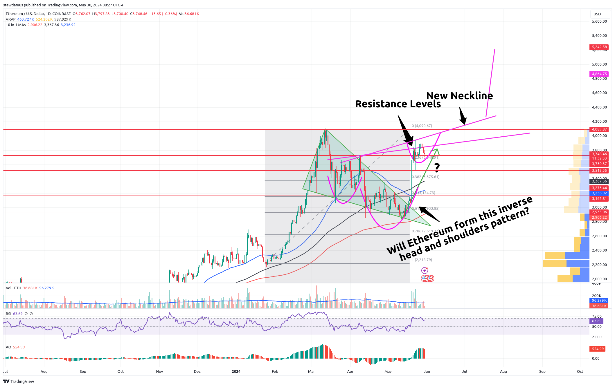 Ethereum continues on its predicted path. We could see a drop to $3515 before bullish price action resides.