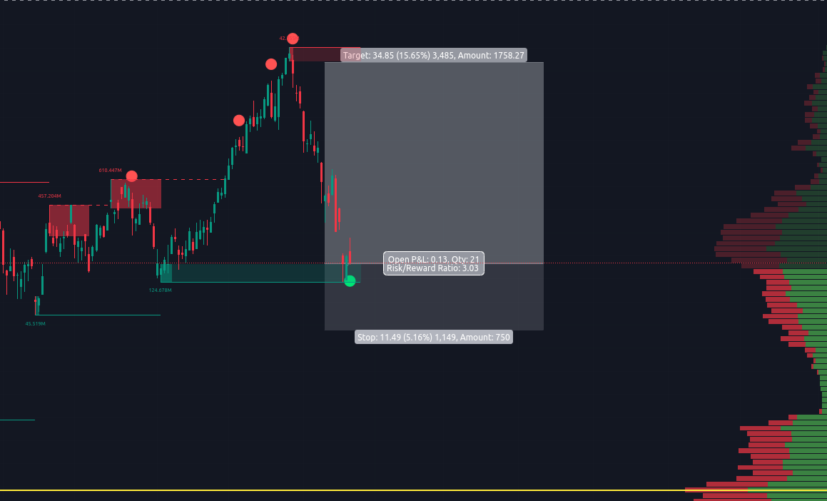 I know I had a higher final target on Uber (and it could still hit that), but I think it may pause for a bit here and I needed to free up some funds in our portfolio to buy a new signal. My indicator has given me the green dot in a liquidity block and alerted me to buy here for a 1:3 rrr and 16% potential profit. I can’t pass this up.