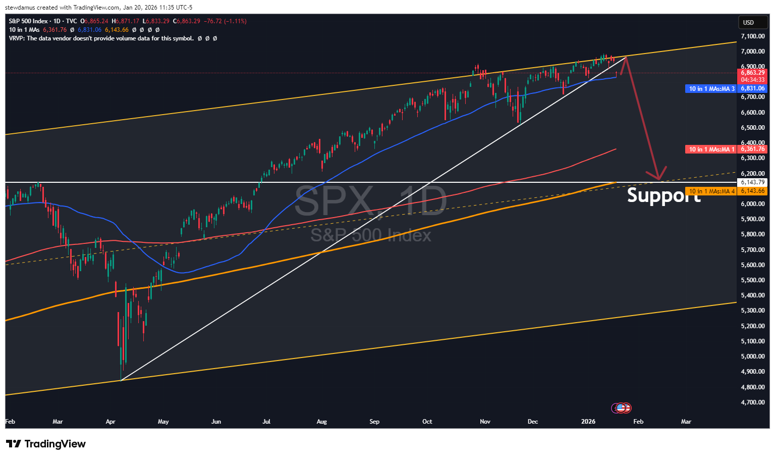 Again, as stated in my previous video post, I would expect us to draw back to at least that 200-day SMA in red. More likely, we’ll go to support, which intersects with that 350-day SMA (orange) at around 6100. If we go lower and break below that 350-day SMA, we’re likely to test the bottom of our channel.