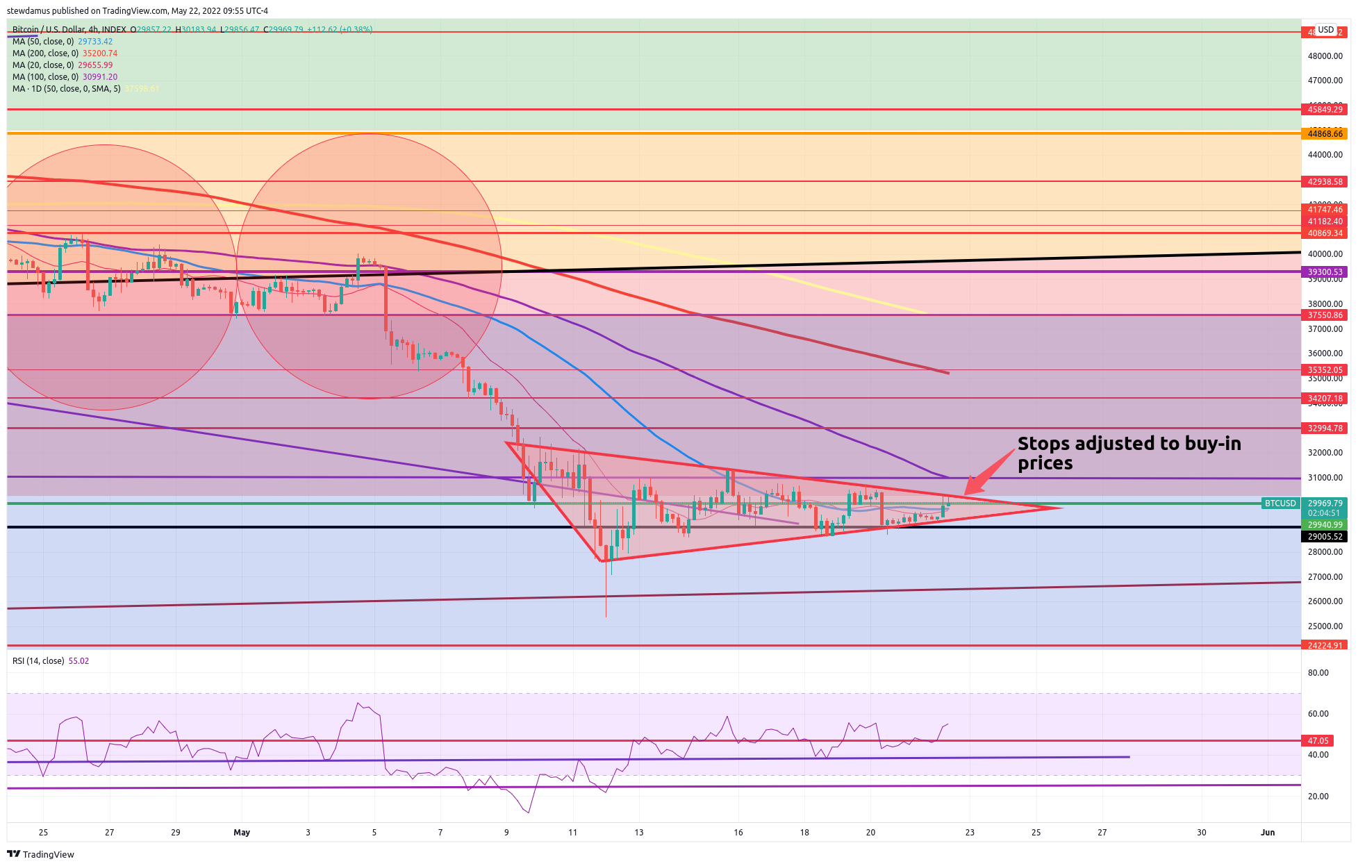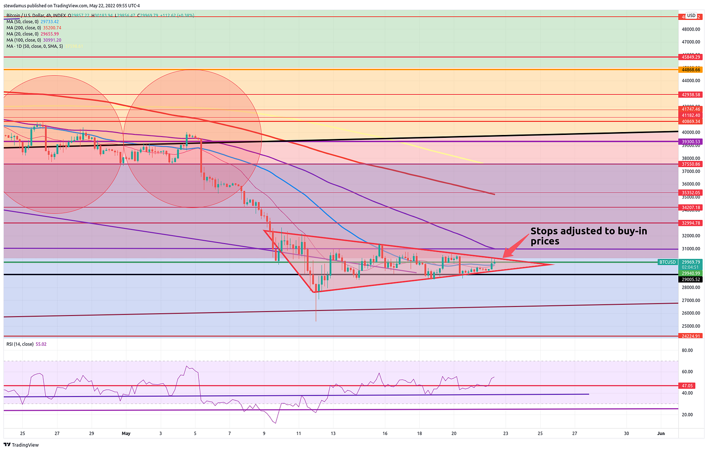 All of my recent trades are in the profit now. I have adjusted all of my stops (moving them up) to my buy in price (with the exception of Bico). If BTC continues to the top side of this triangle, I will adjust again into the future. Here is the most recent BTC chart as well as where all of my current stops are set.