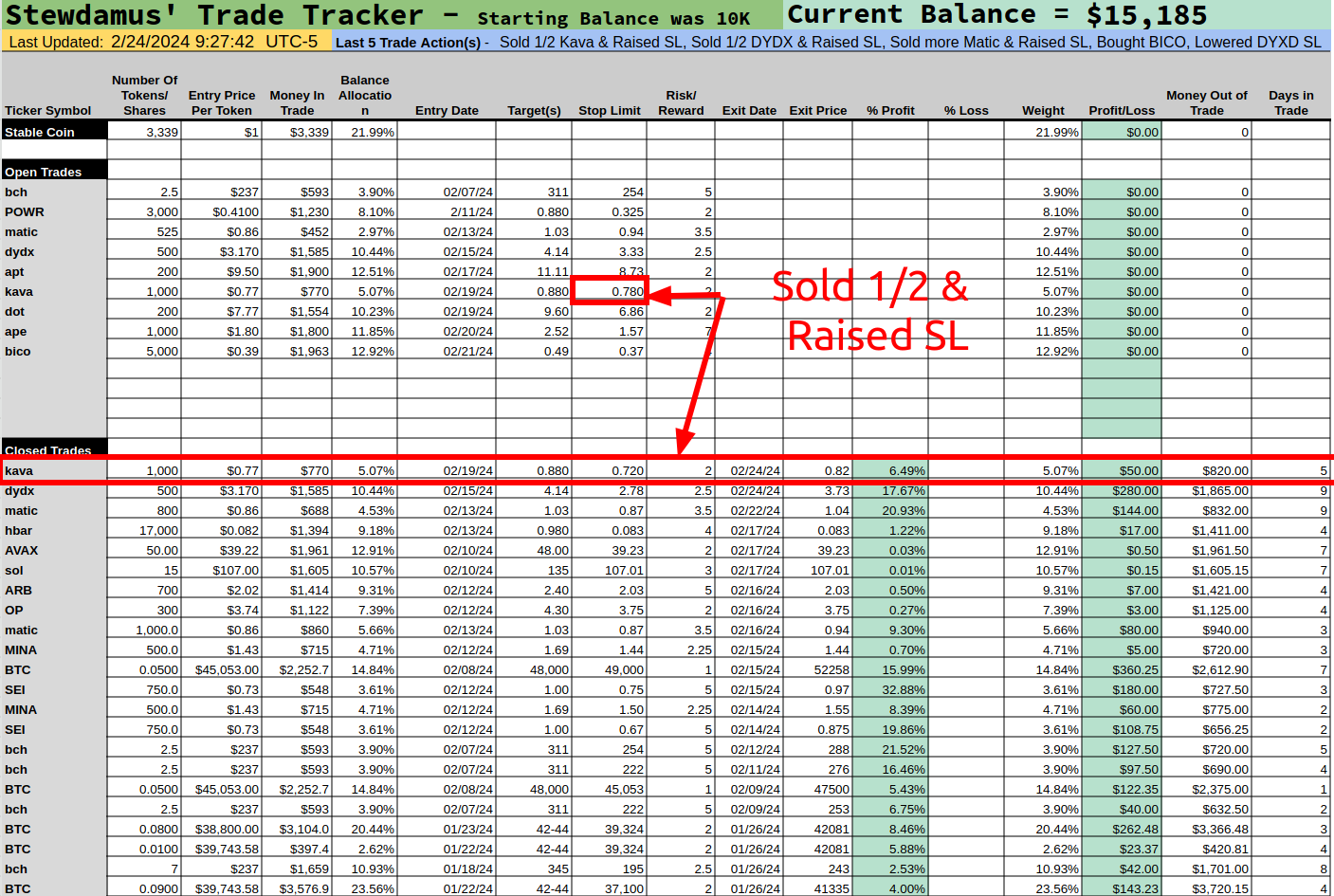 Sorry for the multiple posts. Just noticed that Kava had kicked off a sell order at .82 cents as well. Sold half here and I have just raised my stop level to one penny above break even.