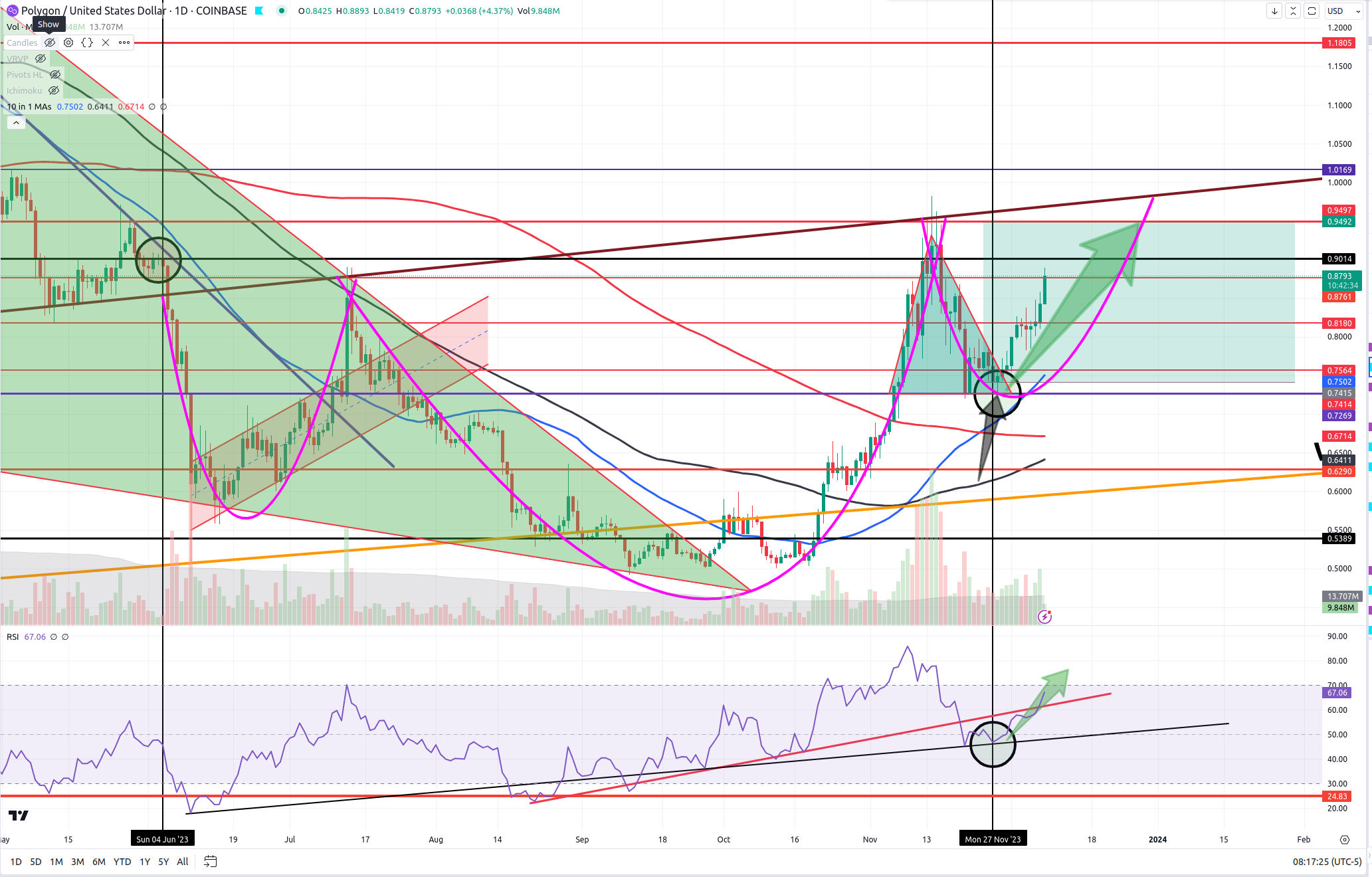 Traders, we’re over halfway to our target on Matic and I would be remiss not to take some profits here. I’ve captured nearly 19% profit on half of my entry here and have raised the stops to .76 so that I cannot lose on this trade now.
