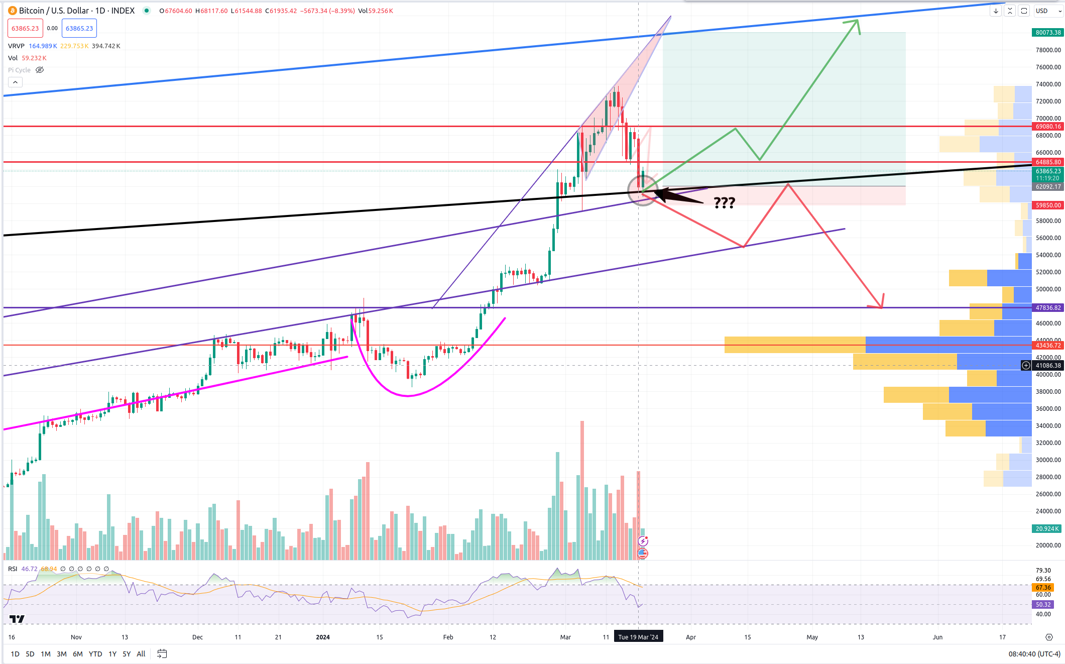 Last night you know that I went long BTC and ARB. The thought process here was that we had come down to that black rising multi-year s/r tl and would bounce. Thus far, I am a little underwhelmed with the bounce. We haven’t closed the daily yet, but we have had half a day and have not even touched 64.8k yet. This shows weakness and that there may be more selling to come. Until we produce a daily higher high, we can expect this downtrend to continue, possibly even breaking back below our strong support. If that occurs with confirmation, you can know that my bias will immediately change.