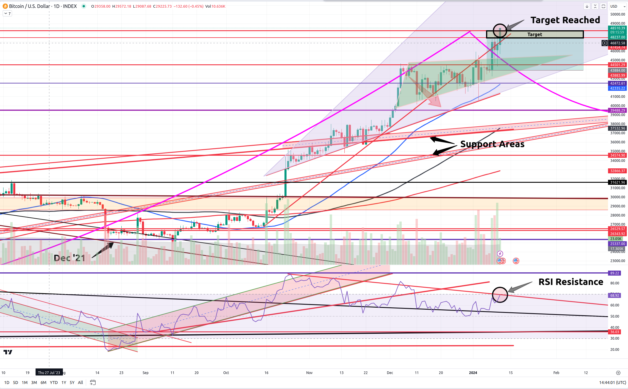 Additionally, you can see we’ve also reached RSI resistance exactly when we touch 48k. This is very significant. Watch closely over the next few days. It should be interesting.