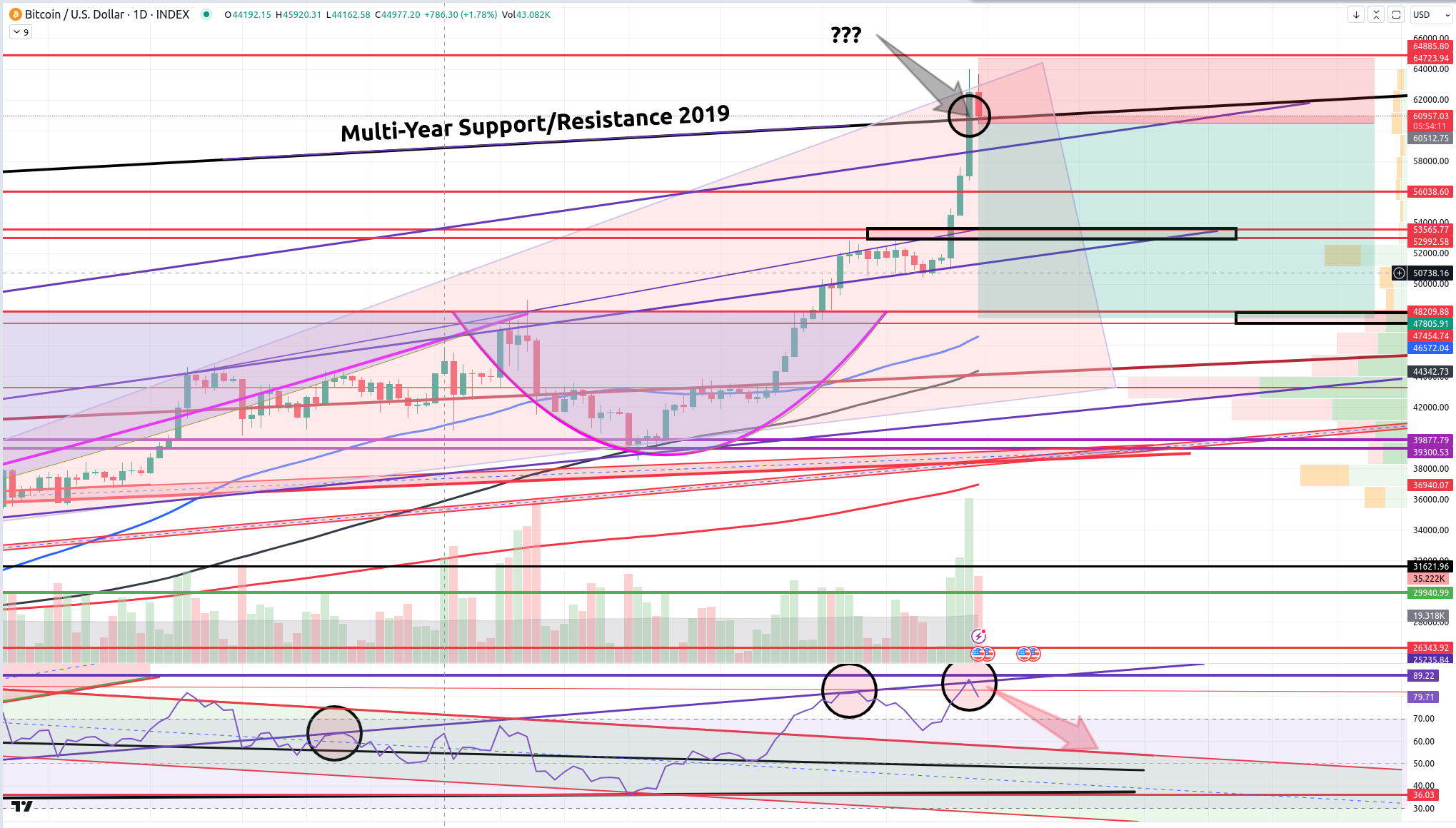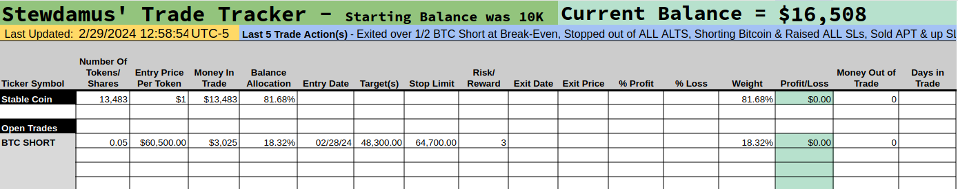 Most of you know I went short big on BTC yesterday just before the price break above 60,500 which is the point at which Bitcoin breaks above that multi-year support/resistance trendline from 2019. I quickly observed my stops were too tight and was able to loosen them just before the 63,000 price breach where my stops were previously located. I moved my stops up to 64,700.