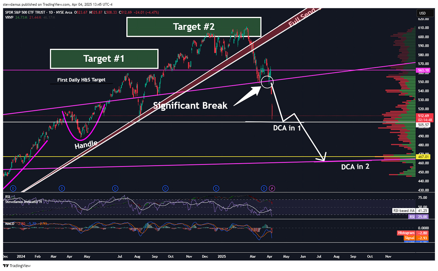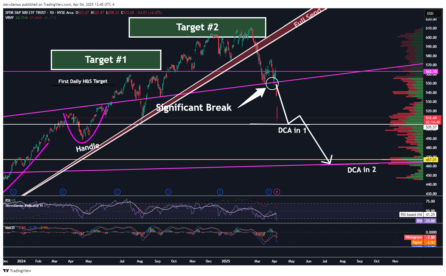 Shorter-term I am seeing two prominent areas of support. The first has almost been reached at 505. If I would have played this correctly, I'd be DCA'ing in my first load of cash here. The second area of support is at around 460 and slightly rising daily. This would be where I DCA'ed in another load of cash. However, if that broke, I'd exit immediately and reassess the charts. 300 is a long way down, but over the past 5 years we have seen some extraordinary market price action and volatility. TBH, even the best of us technicians are struggling to understand the larger macro-economic picture, but I'd wager to say that tariff fears may be overexaggerated as market reactions often tend to be.