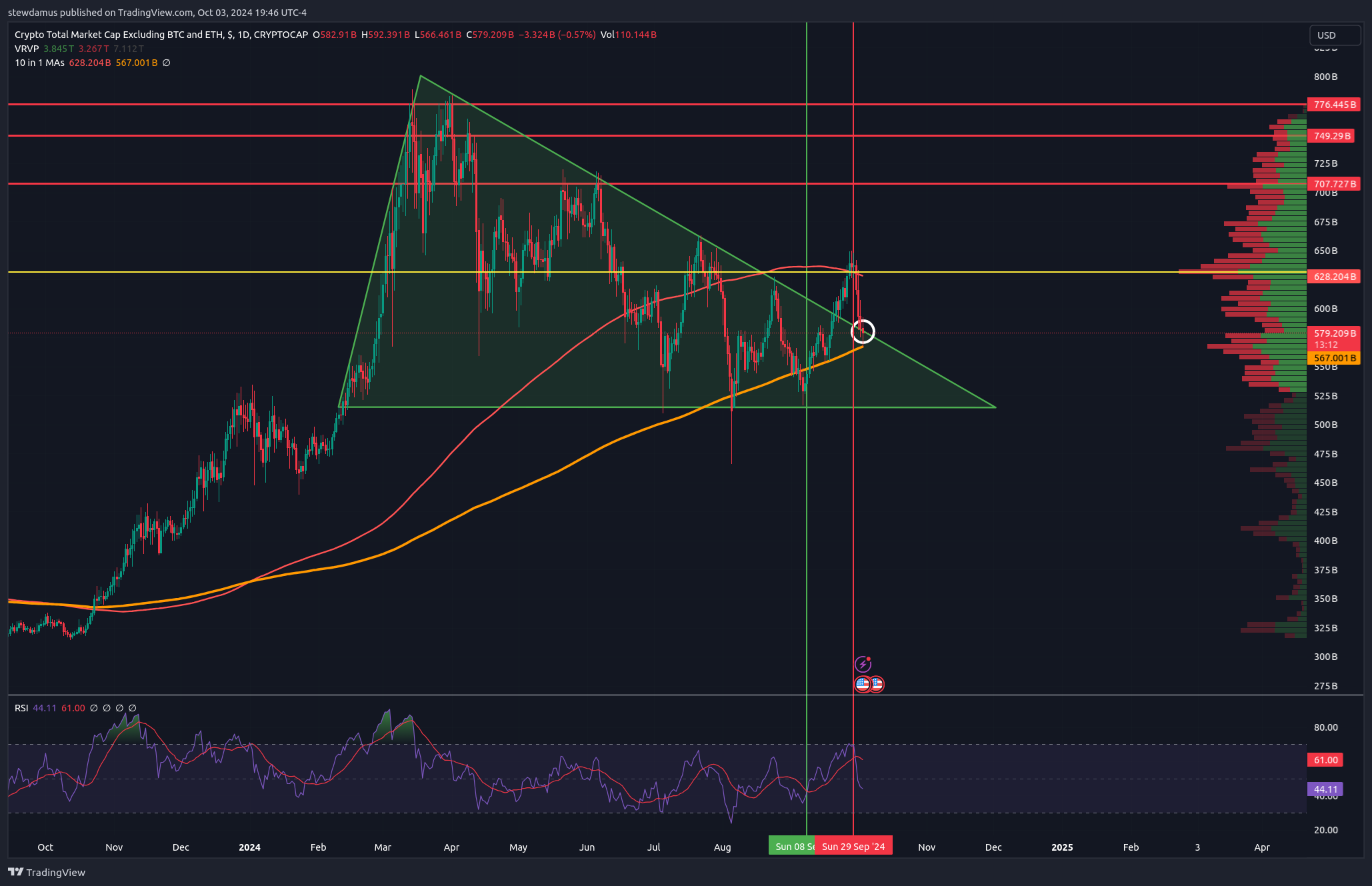 I kept our chart on the daily view as opposed to the weekly because I wanted you all to track that bullish triangle with me. Notice how we are retesting the top of it as we should after a breakout. This is technically very sound. But also notice how that 350 DMA is moving up to lend some support. What a beautiful area of confluence! But also, scary. Because if it's broken to the downside, it may indicate either another Black Swan event on the horizon OR we don't get the bull run alts were expecting.