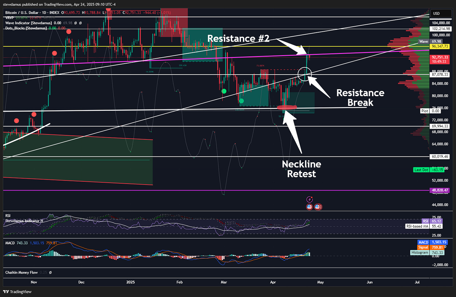 Bitcoin 76k support has held. As I stated in my last post on Bitcoin, this was an absolutely critical support. Fortunately, it held. The trend now looks to have then reversed as we moved upwards and broke through important overhead resistance at 87k. We are now up against 94k (Resistance #2). I would suggest that if this second resistance is broken to the upside on the daily, we have our confirmation that the trend has clearly changed and will continue upwards through 2025.