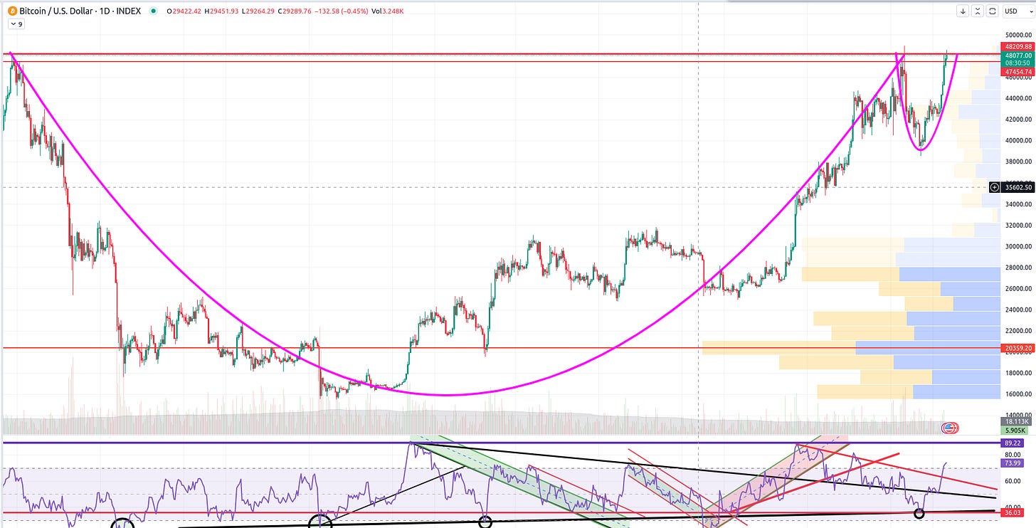 Let’s make this as simple as possible for Bitcoin. It’s really this - Bitcoin must beat 48k to continue the bullish trend and confirm that larger cup and handle pattern is in play which will take us to 80k.