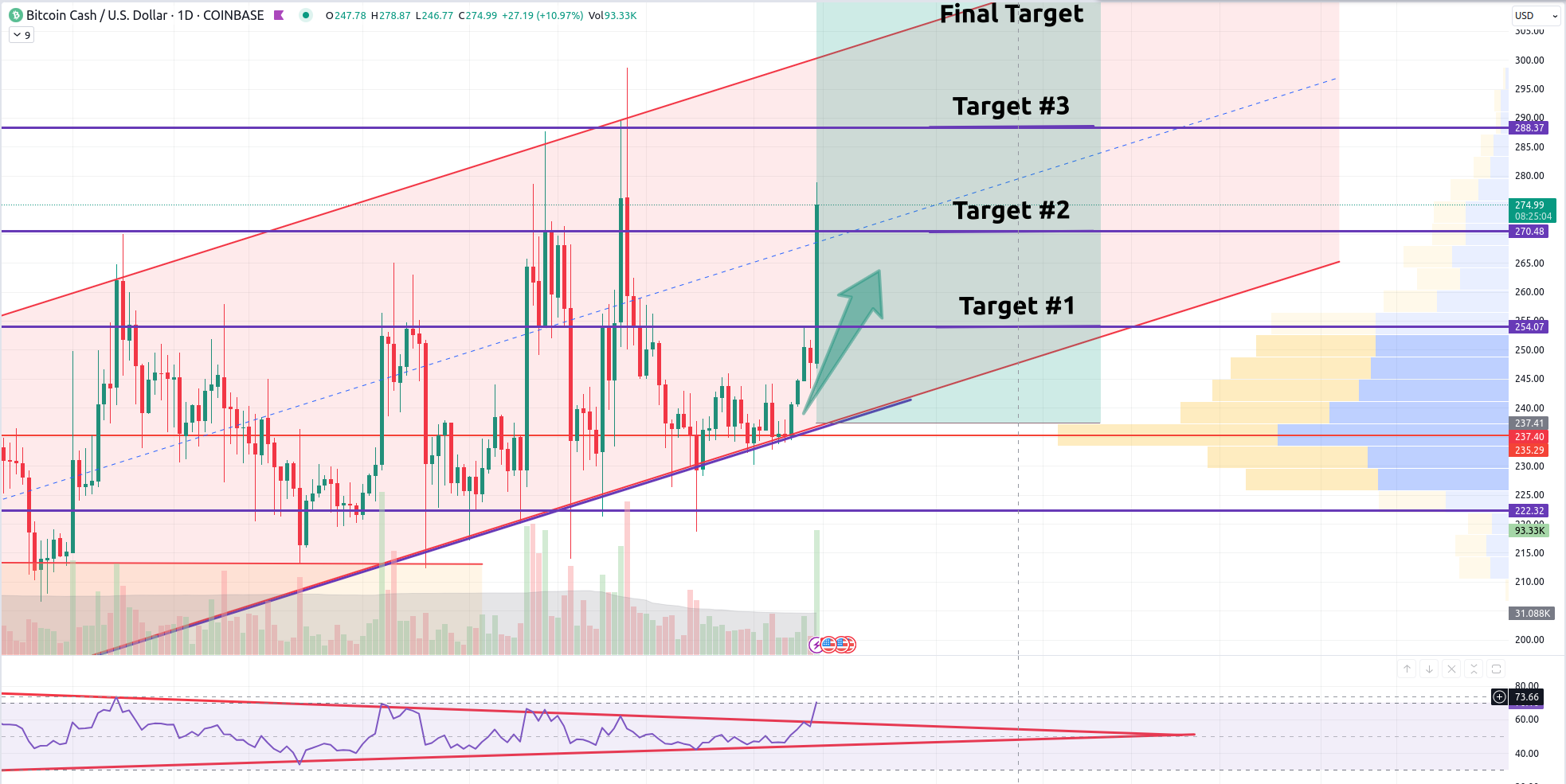 Now as far as trades go, I’m still half in on my Bitcoin long but I have raised my stop all the way up to 47,500. Bitcoin Cash (chart below) has reached it’s second target and true to form, I have pulled another quarter out for profit. Solana and Avalanche have yet to launch so I am keeping original SLs in tact for now.