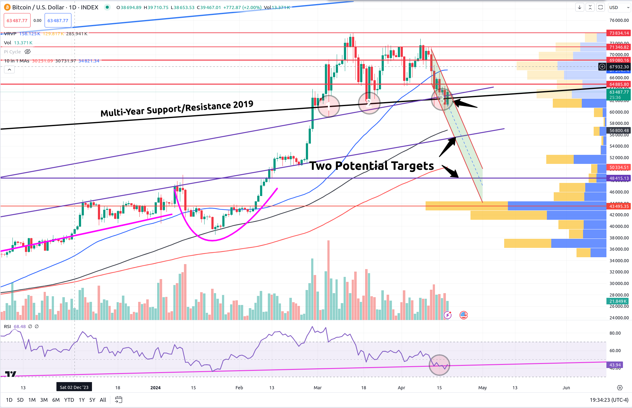 Although our daily candle came right back above our multi-year trendline today, we have merely created a daily lower high with this candle close. This means we are still in a technical downtrend. I wouldn’t be surprised if we mess around in this area with price over the next several days. Market makers love to play traders out over significant levels and price points like this in uncertain times. This emphasizes the need to have a strategy and stick to it. My strategy is that I am long above the line. When we dropped below the line, I planned to offload my riskiest assets. Did that yesterday. With a drop below AND confirmation (which we did not get today), I planned to have my stops set in a way that would sell as we dropped. Thus far, the strategy has worked out for me and none of my positions have dropped off yet. This, of course, could change quickly as we continue to trend down.