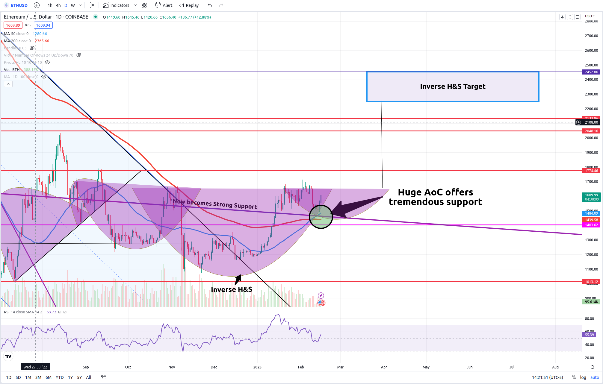 #1 - The inverse head and shoulders pattern. Ethereum looks to be forming this bullish pattern, though not completed or confirmed yet.