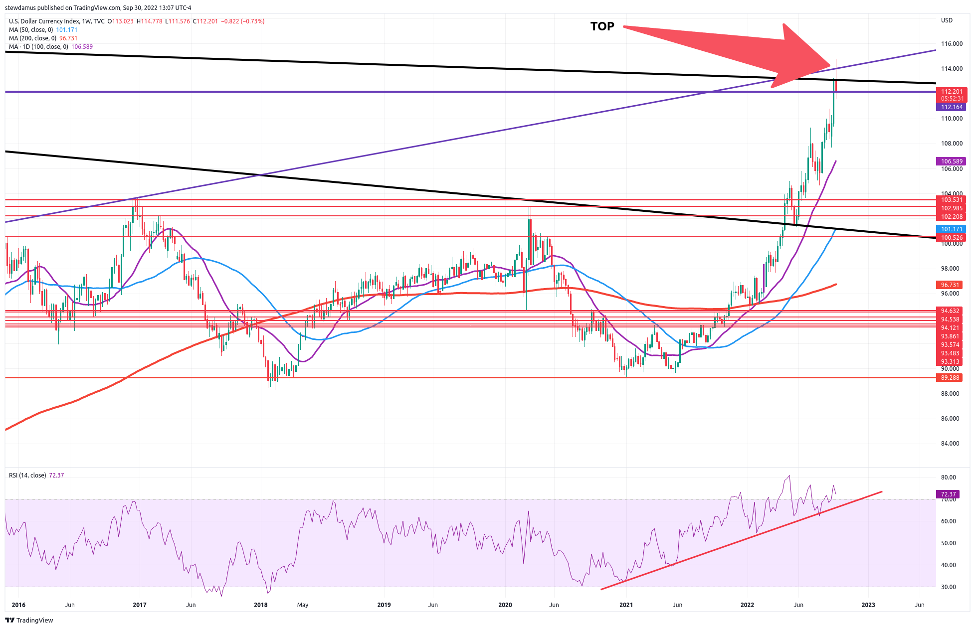 As you all know, if you are following me on any of my SM sites, the dollar hit a key resistance trendline this week which has only been touched twice (this being the third time) since 2009. Then, as expected, it turned right around and started to dump. Will this dump continue? Unknown at this point. However, you all know that my sentiment favors the fed coming to their senses soon, digesting all of this disinflationary data that is coming in hot and heavy (and way ahead of the CPI report), and reconsidering their current strategy. We’ll soon know (like within weeks) whether or not my theory here is correct.