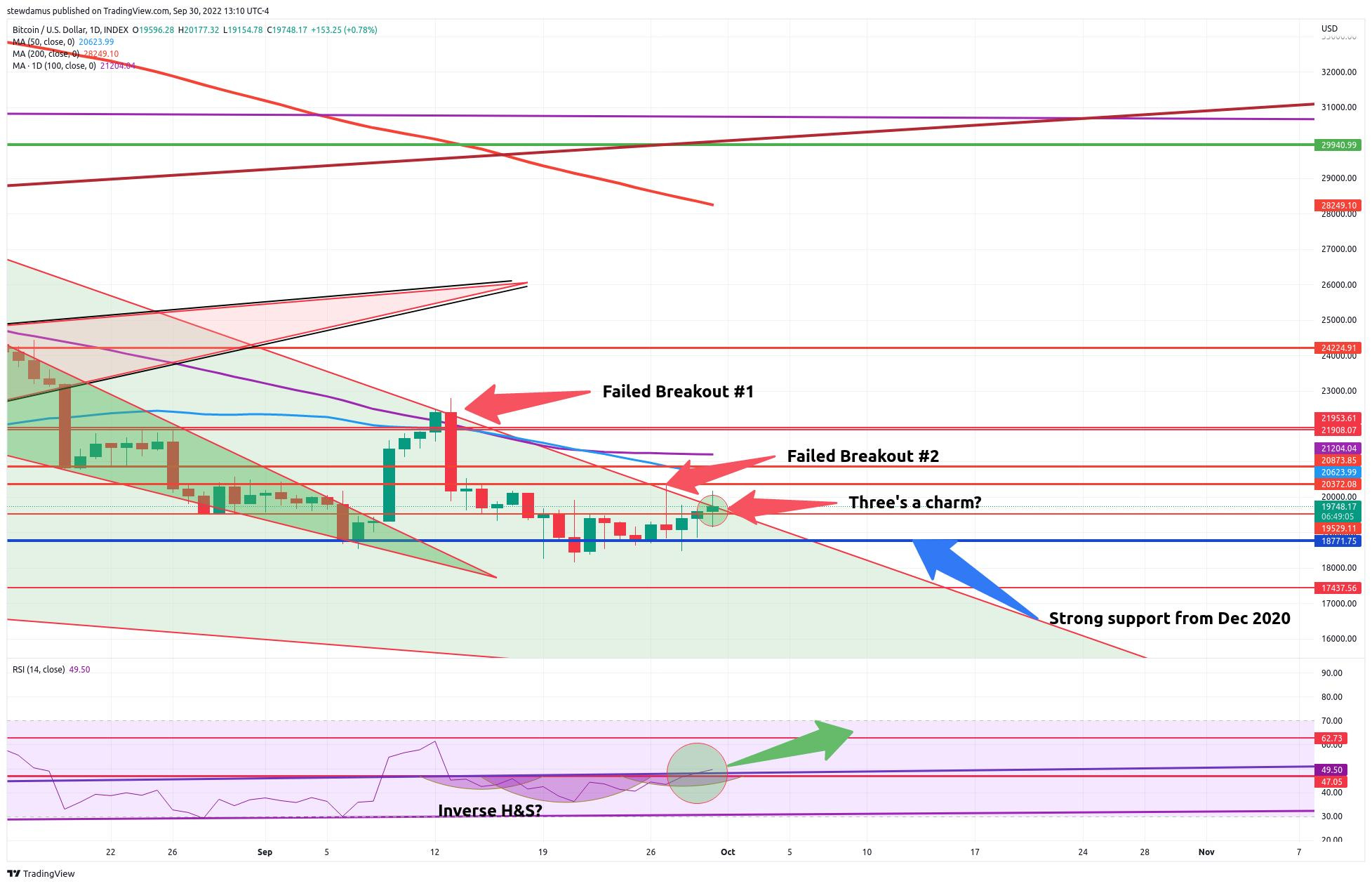 And what is King Bitcoin telling us? Unfortunately, absolutely nothing right now. It wants to break to the top side of our long-standing year old bullish descending wedge. But the bulls just do not have enough conviction and strength to do so at the moment. Bitcoin is waiting for the broader markets to determine future price direction. And that is why the first three charts I posted are extremely important.