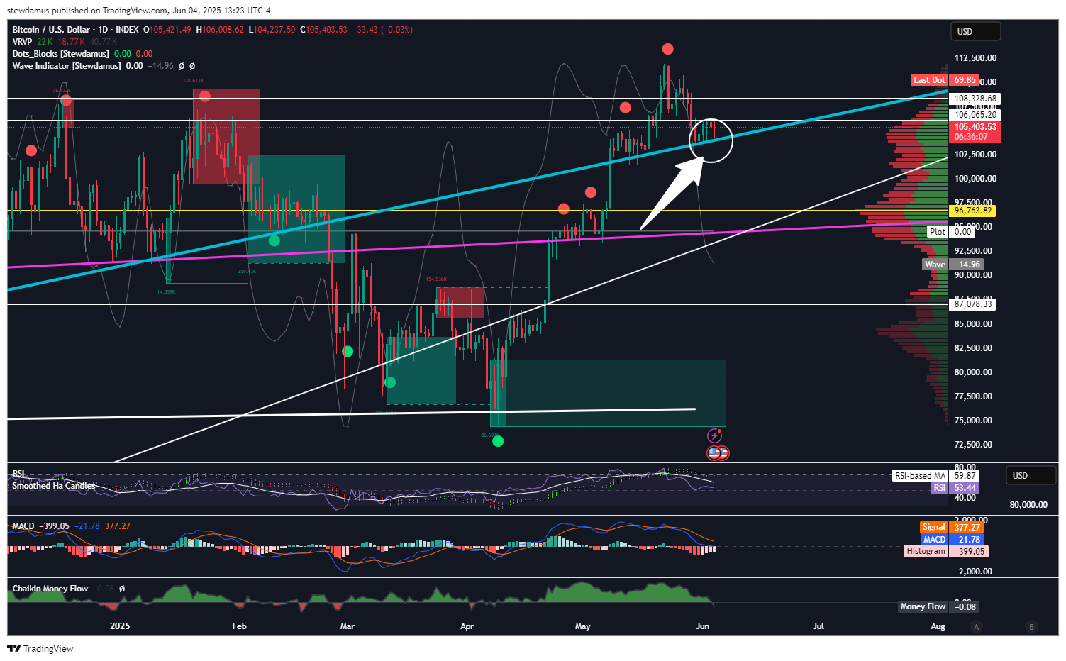 While it is somewhat unclear what Bitcoin's next move will be (though I tend to lean towards more upside bias), one thing has become clear ...that aqua blue trendline I have drawn on our chart is proving its significance. Currently, it holds as support. A break to the downside though, and I expect us to drop all the way to 96k. If it continues to hold, a break above our recent high should be expected and new highs will be formed in a relatively quick timeframe.