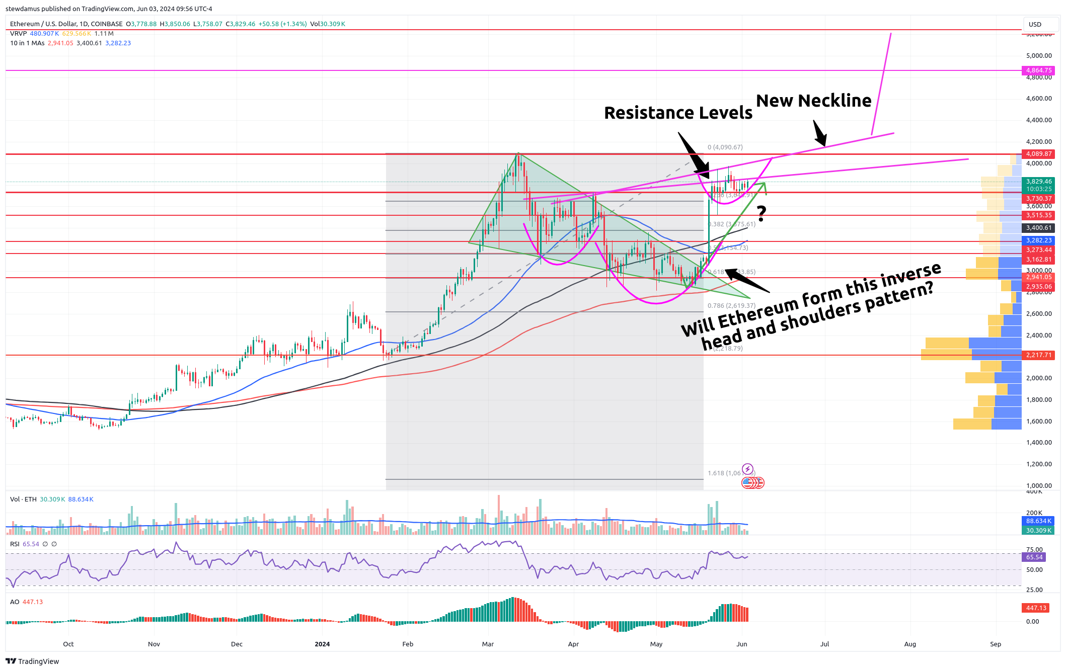 However, ETH ETFs will give Ethereum and therefore altcoins a nice bump/pump and I believe that, as long as ETH can hold this current support level at around 3700, then altcoins have found their local low. In other words, altcoin season is close. Supporting this theory is this inverse H&S pattern which I spotted well before the right shoulder had even formed. We can now see that this pattern appears to actually be playing out and Ethereum should remain strong for the remainder of 2024, though the possibility of breaking support at 3700 and dropping to 3500 still remains relatively strong as well before further upside. Adjust all stops accordingly.