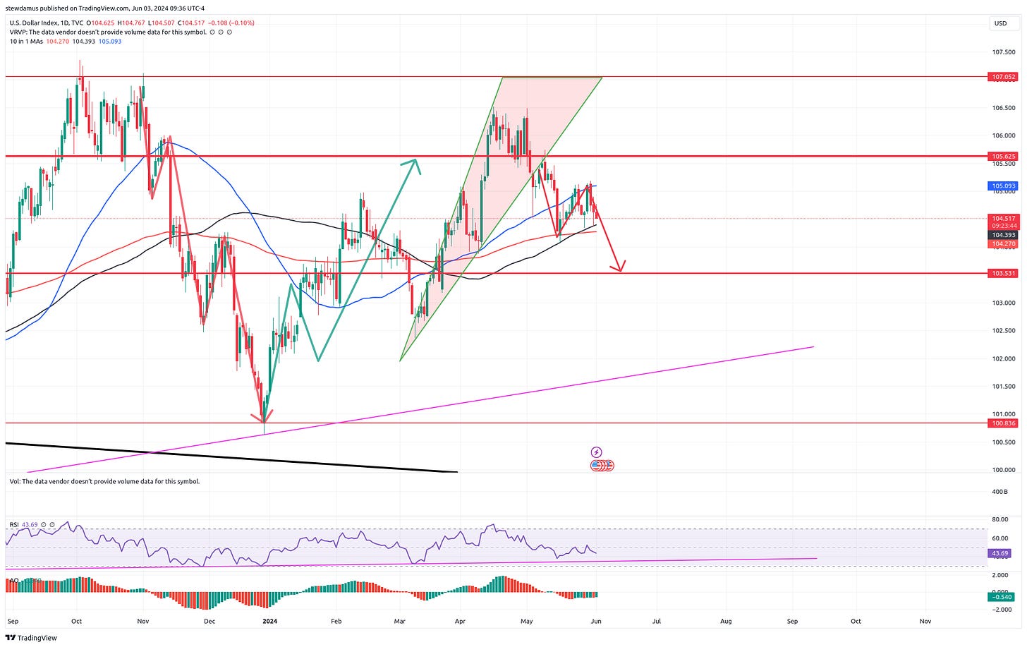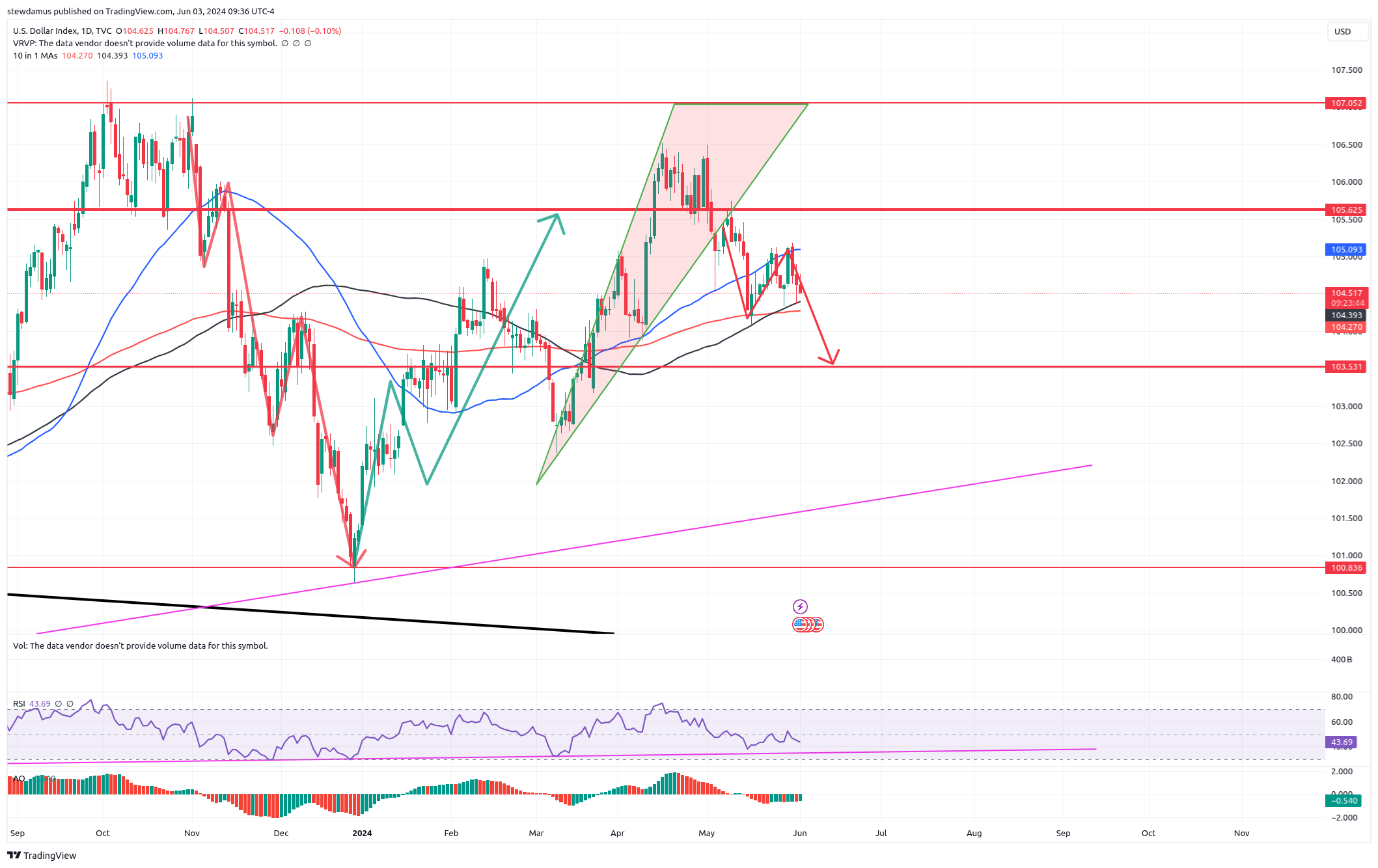 All this being said we can then continue to expect the dollar to travel its expected pathway …down. 103.5 is the next support. Below that is that pink ascending trendline around 102 and rising.