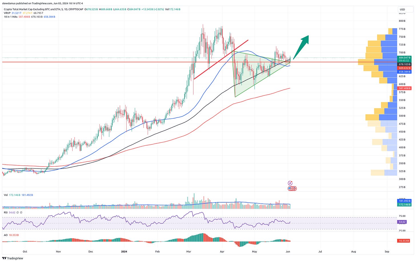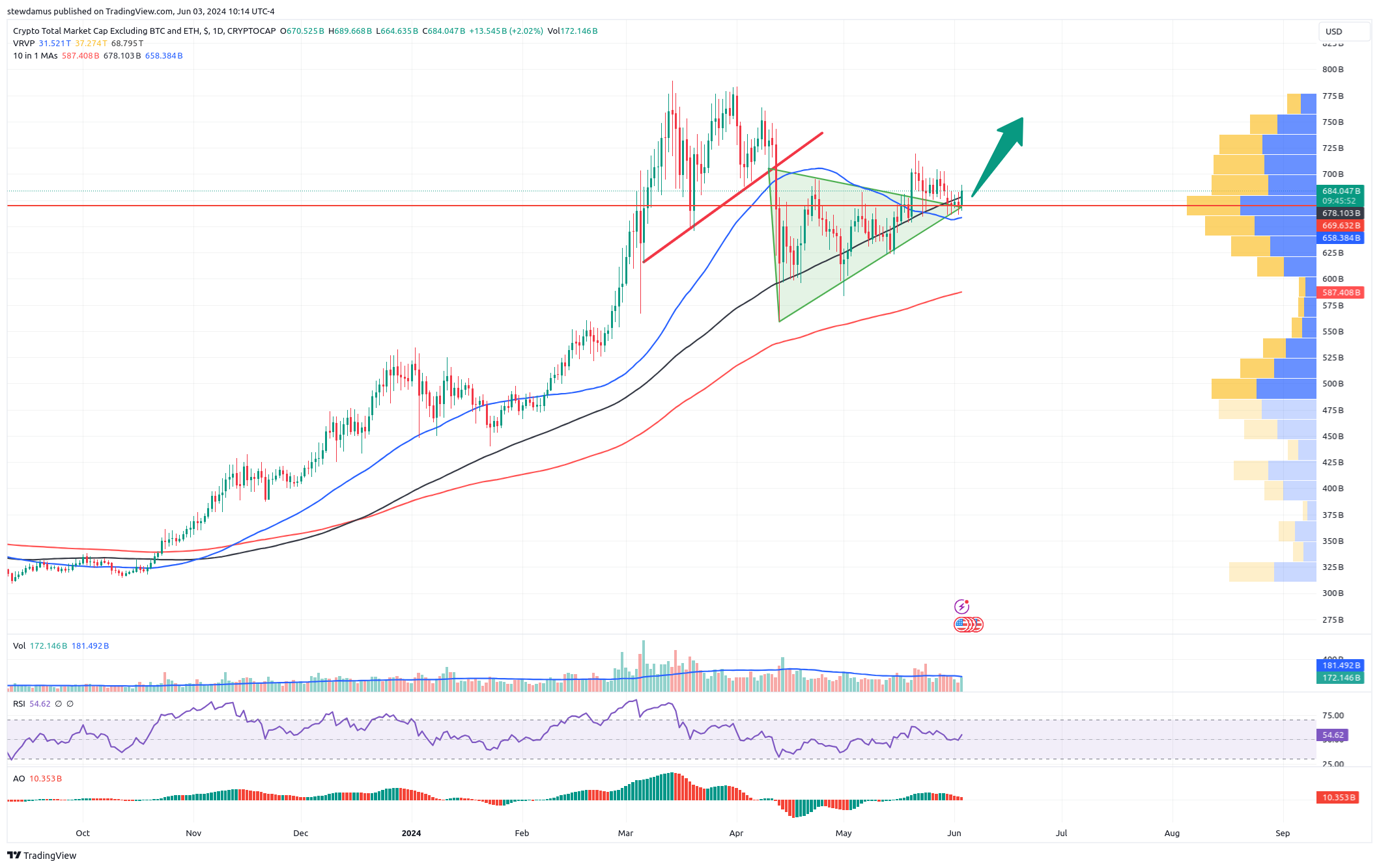 Let’s wrap up by taking a look at our Total3 chart which includes all alts except ETH. This shows a strong bullish bias. We’ve broken to the upside of our triangle, retested the top of our triangle as support, and are now using that strong PoC from our VRVP as support along with our 50 & 100 day SMA. I love to see all of this as it signals good things to come from our alt space ahead.
