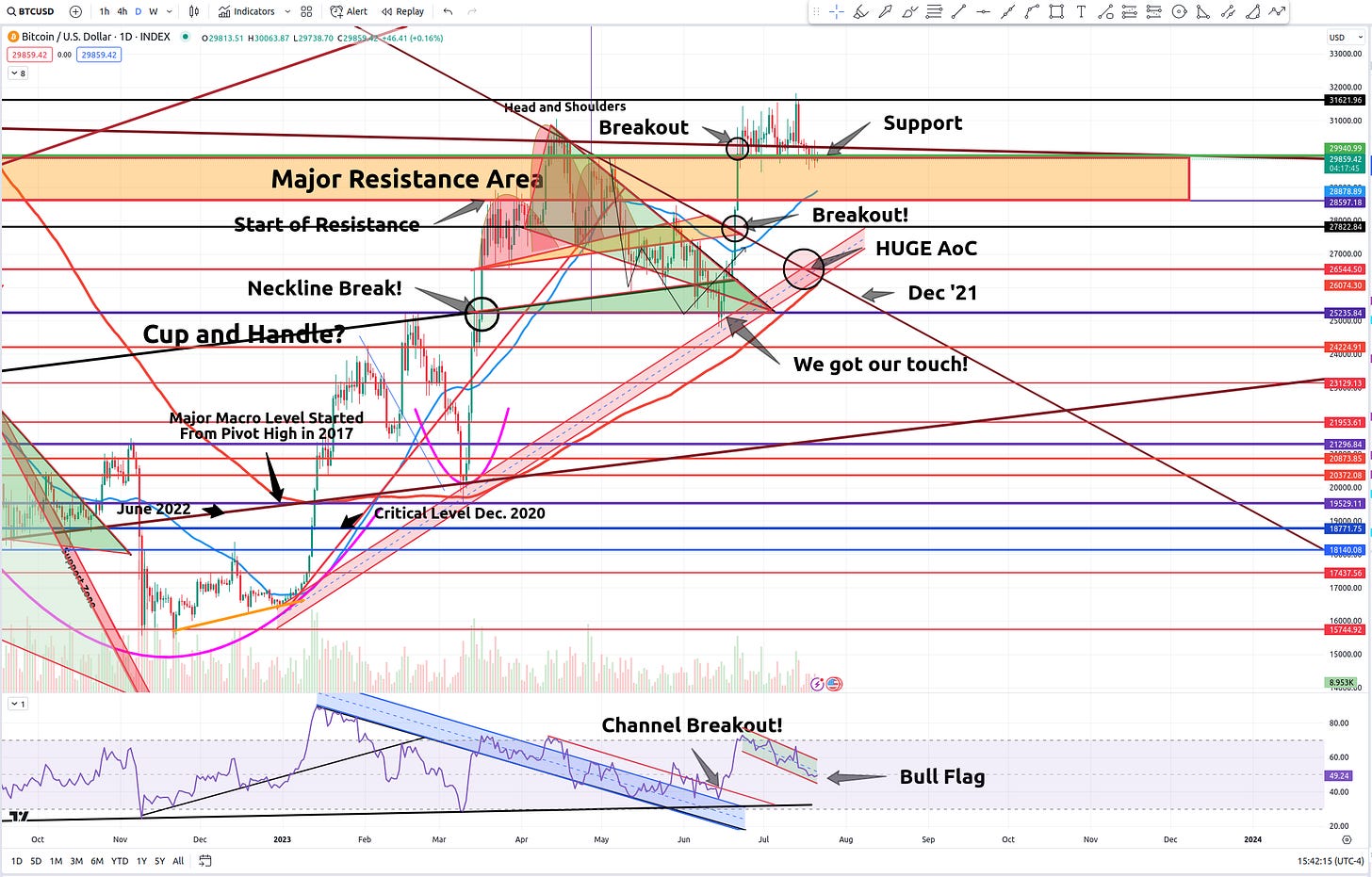 That green level that we're flirting with rn btw ...that marks (approximately) the body high of the June 10th candle of 2022 right when everything went to hell in a handbasket and BTC crashed from our price today of around 30,000 all the way down to 17,500 in just over a week! This is why it is so significant.