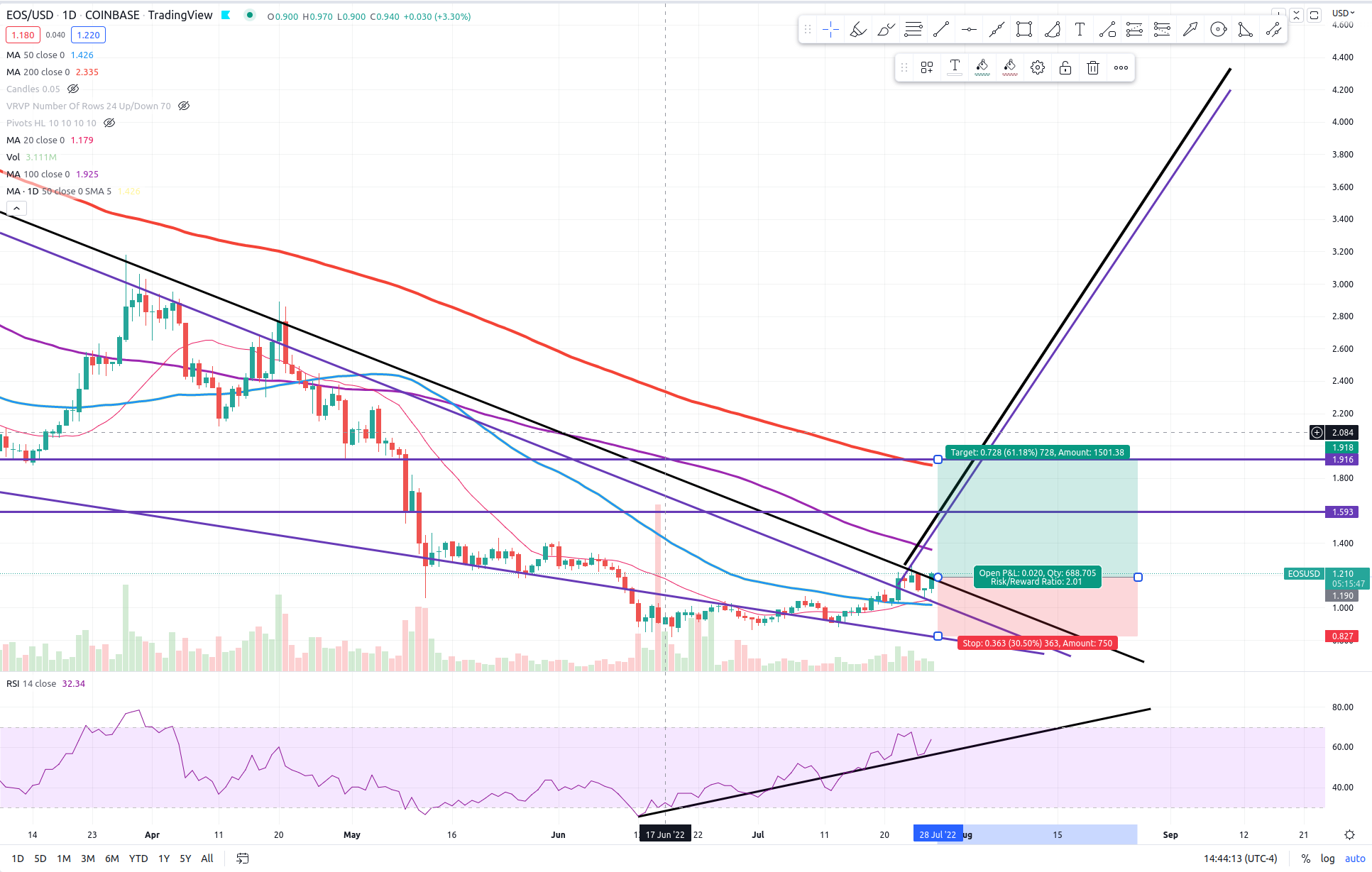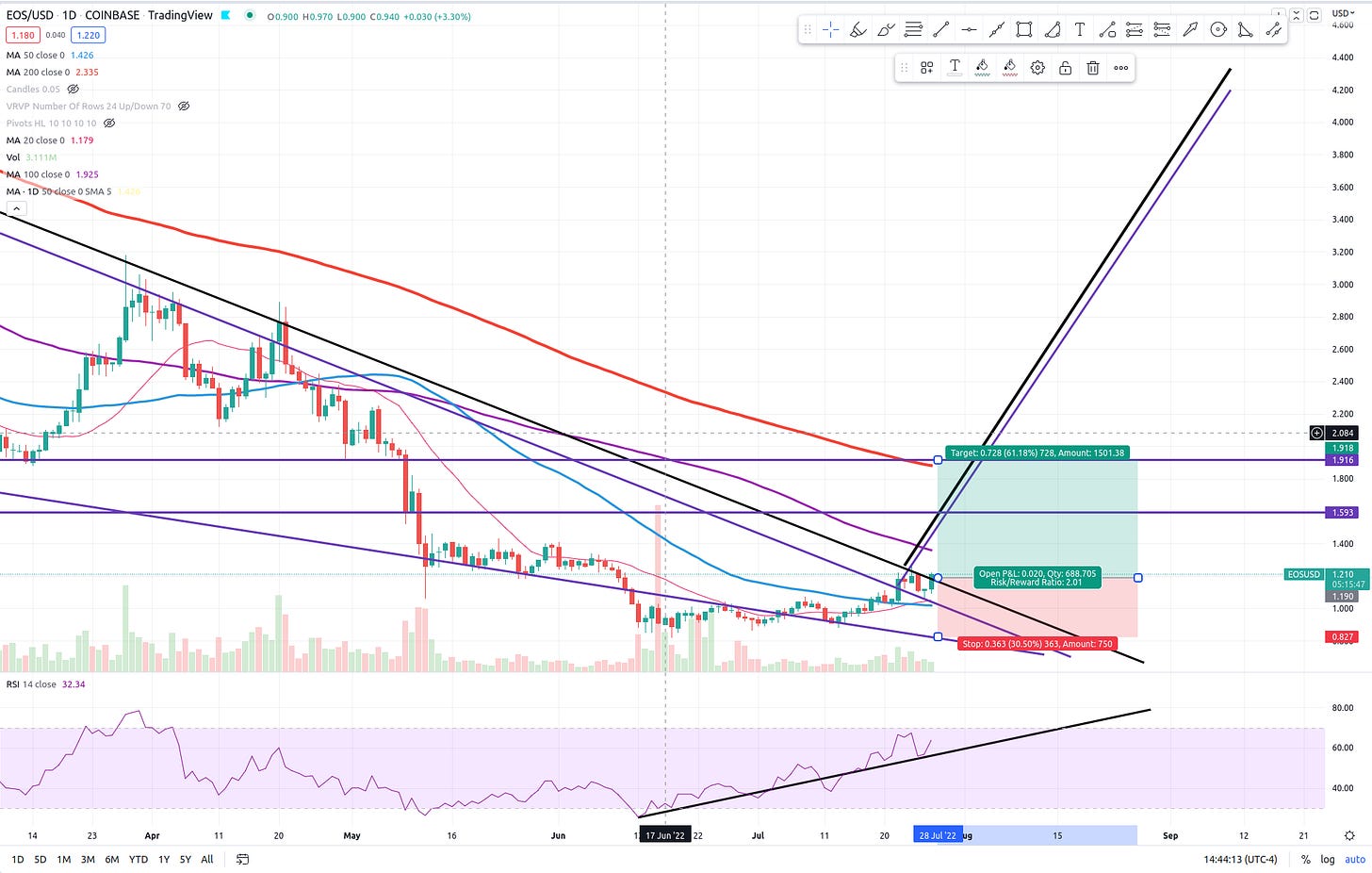 With a potential for %60+ gains from 1.19 entry and a R/R ration of 2/1, I have chosen my next crypto, EOS. Look to take some profits around the 100 day ma, $1.59, and finally $1.91 or the 200 day, whichever you are most comfortable with. I am a bit early, but it looks as if we have broken upside resistance (that second descending black trend line) of a descending wedge that has been forming since September of 2021, almost one full year! This means my targets are actually fairly conservative. So, we’ll take profits at our targets and re-assess when the time is right.