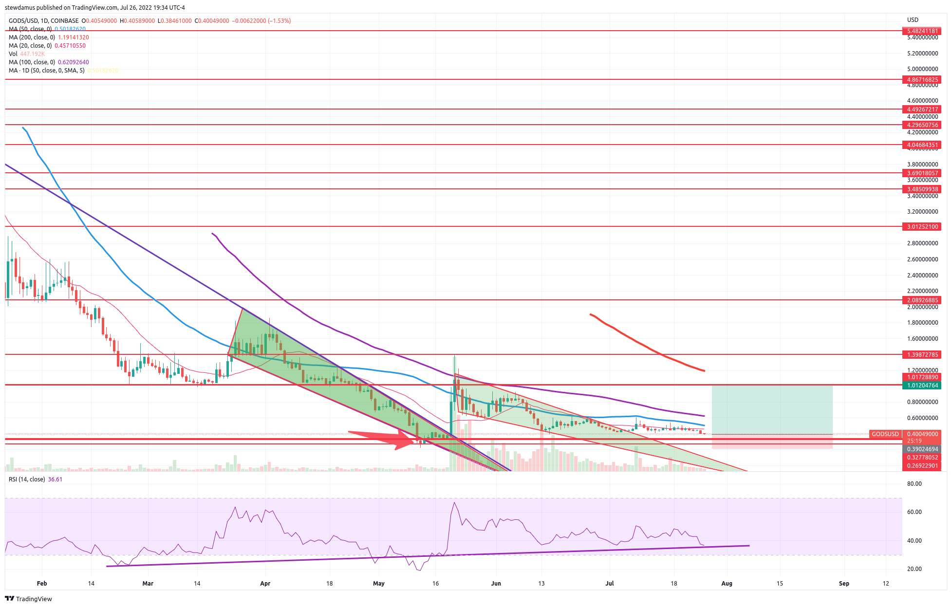 I’m getting bored. All this sideways action is putting me to sleep. So, admittedly, this might not be the greatest setup here. But what I like about GODS token is that when it pumps, it pumps hard! In fact, my final target would give me %150 on anything left in. Of course, I’ll probably take some profits along the way. We have both the 50 day and 100 day overhead. Those are good places to take some profit. All this assumes we go up before down. Which I don’t know will happen. My gut tells me GODS is near a bottom here, but only time will tell.