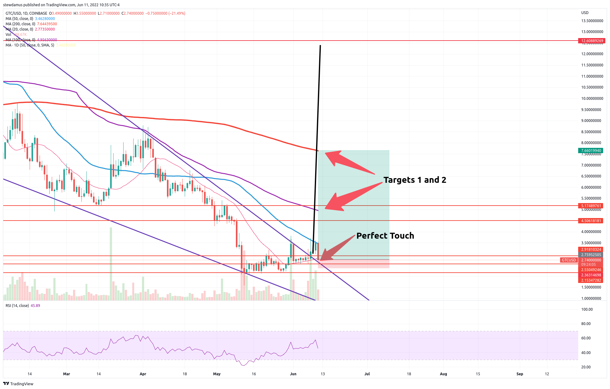 Got stopped out of Jasmy early this morning. Taking that reserve and applying it towards GTC which continues to play out nearly perfect technical price action and I could not think of a better entry than right here at $2.72 where we retest previous resistance. Take a look at this chart. As you remember, I’ve already made profit from the recent 25% pump on the exit of this long-trending descending wedge. I exited at the 50 day ma which I expected to provide enough resistance to drop us back down to previous resistance, now support …the top of our wedge. We have done this precisely and touched! Now, it’s time to go (I hope)!