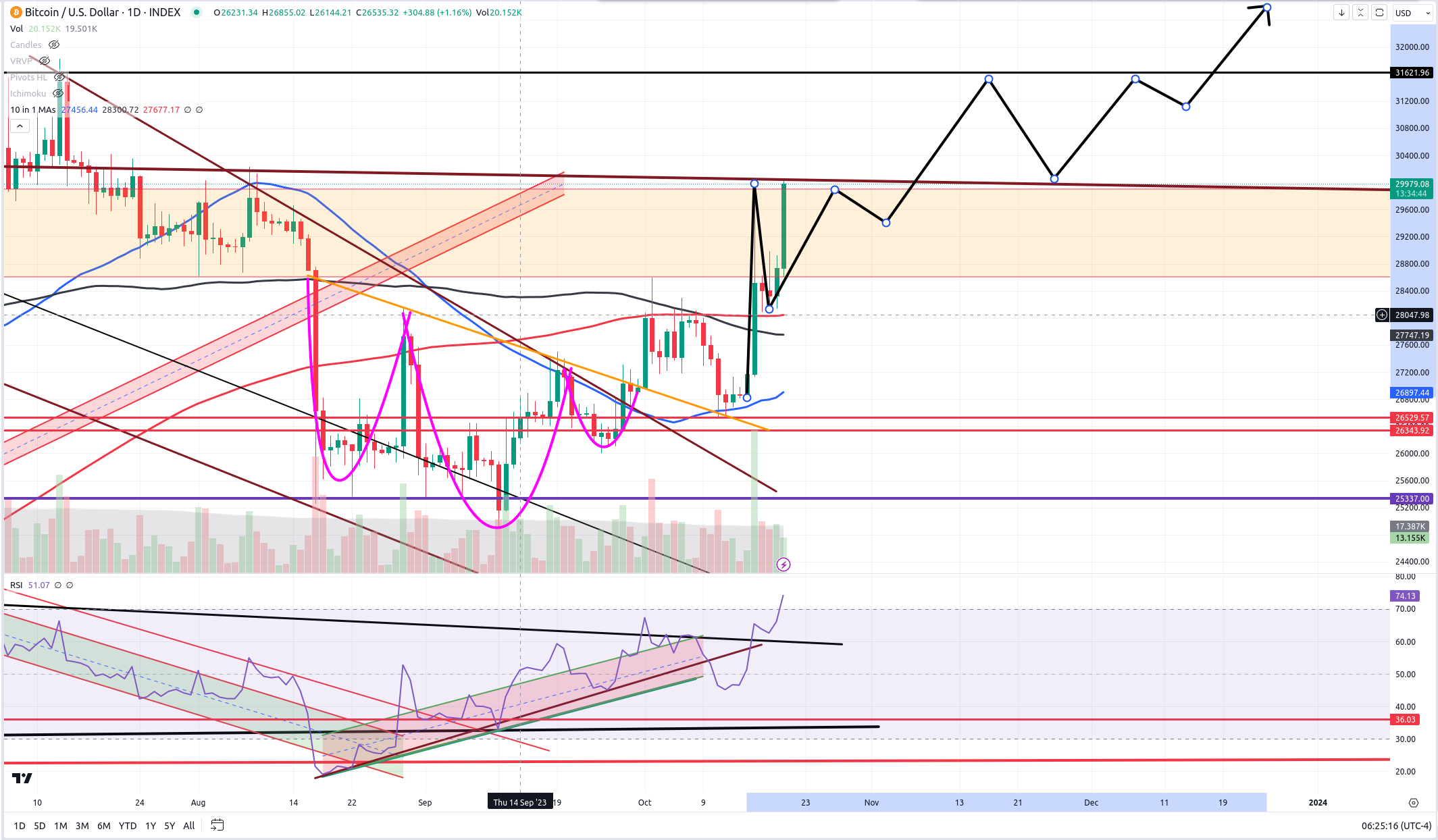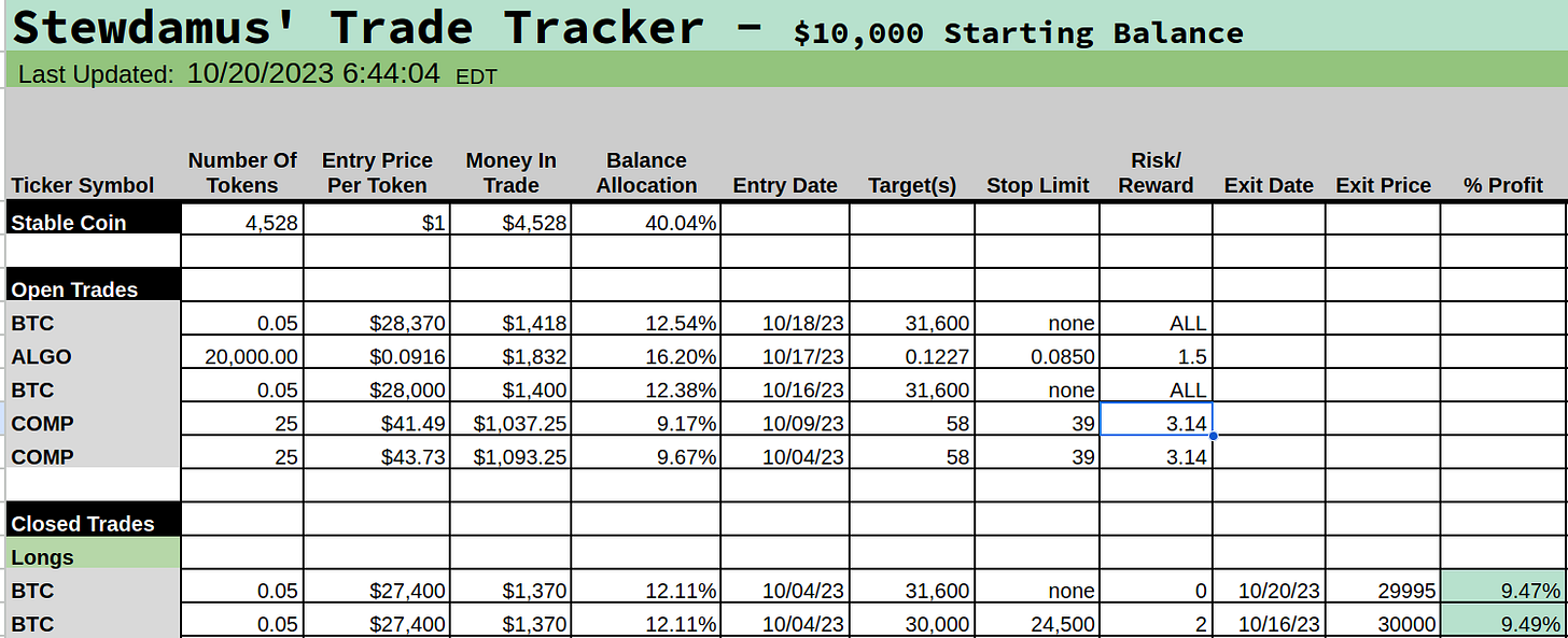 In my last post I projected the future BTC path. It looks to be following that trajectory thus far and so at the critical 30k I took some profit from my BTC trade. I will look to re-enter this profit back in at around the 29,300 price. Almost 10% gains on this trade (see spreadsheet below)! Congrats traders. Now let’s rinse and repeat.