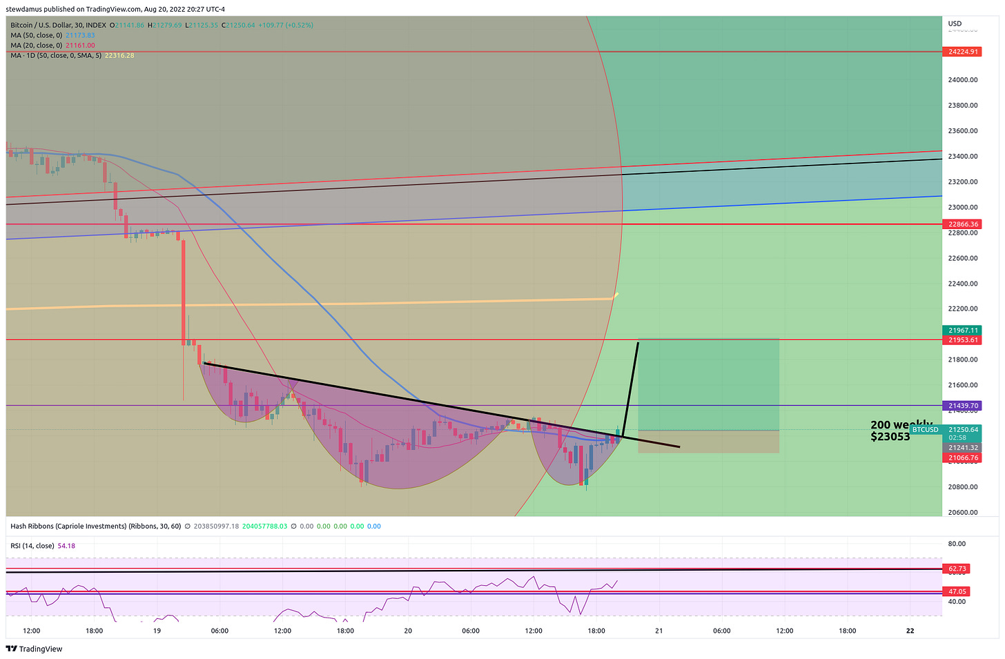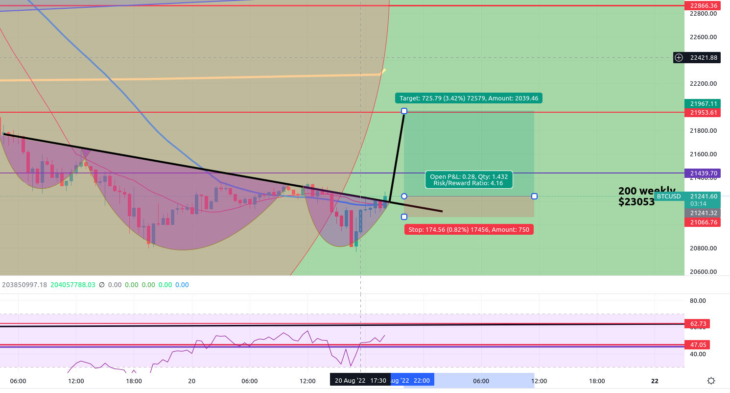 Spotted this inverse Head and Shoulders on the 30 minute. I’m betting 3x it plays out. Target = 21,953. The rest of the data can be found on the spreadsheet: