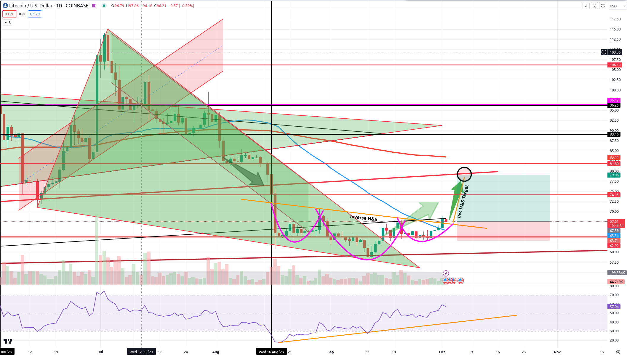 In addition to breaking out of the triangle, LTC has now formed and broken the neckline of an Inverse Head and Shoulders. The target here takes us straight to the underside of that RED TL (major resistance) and that will be my target.