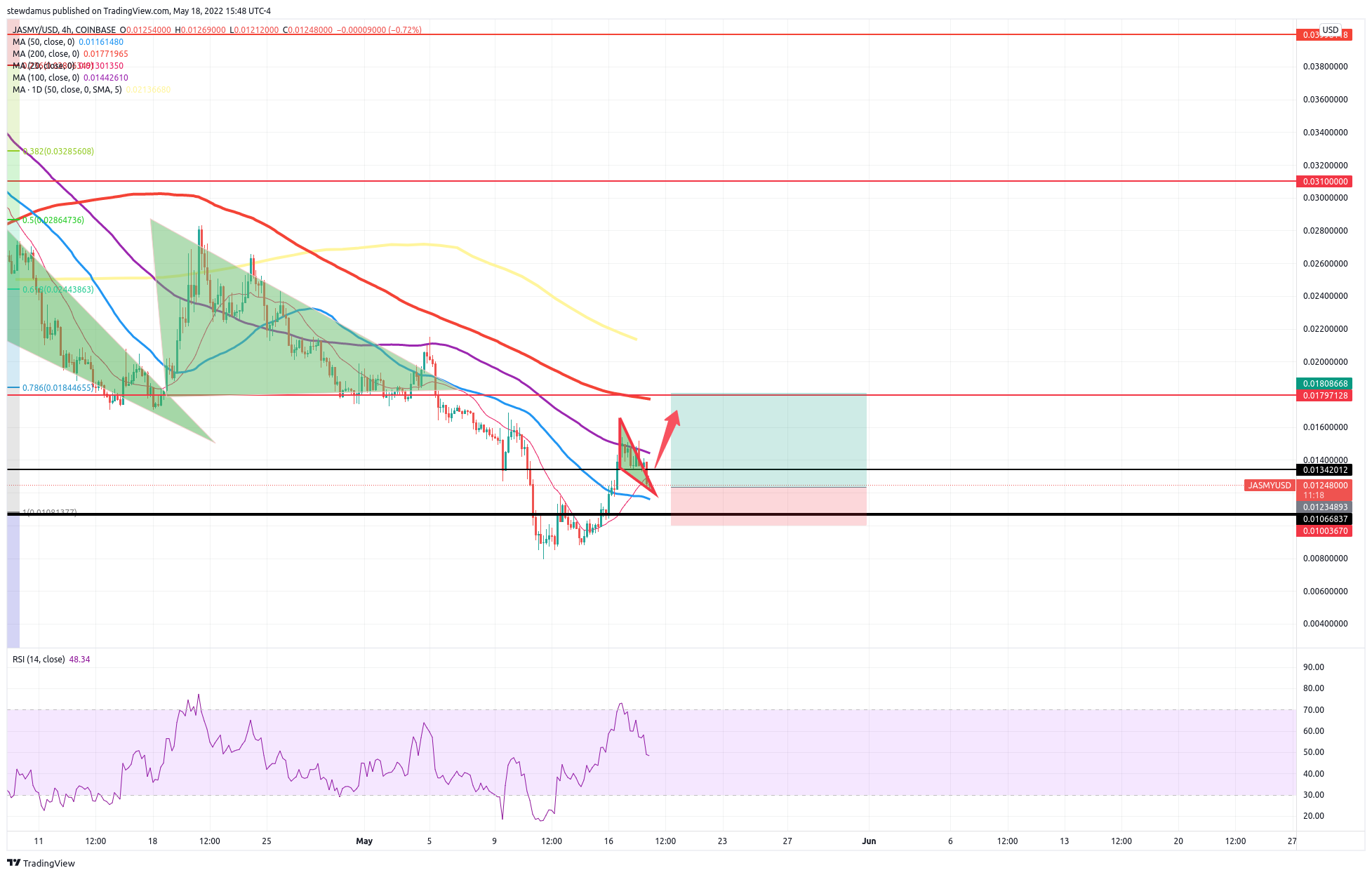 Going to DCA in on ole’ Jasmy here. This to me looks like a bull flag. Even if it isn’t Jasmy has been holding strong during these tumultuous crypto times. I believe, eventually, it will take off. This one is more of a long term hodl’er for me. But if you’re into trading it then set your stops somewhere around or below 1 penny. Target will be 1.8 cents for an R/R of around 3.5.