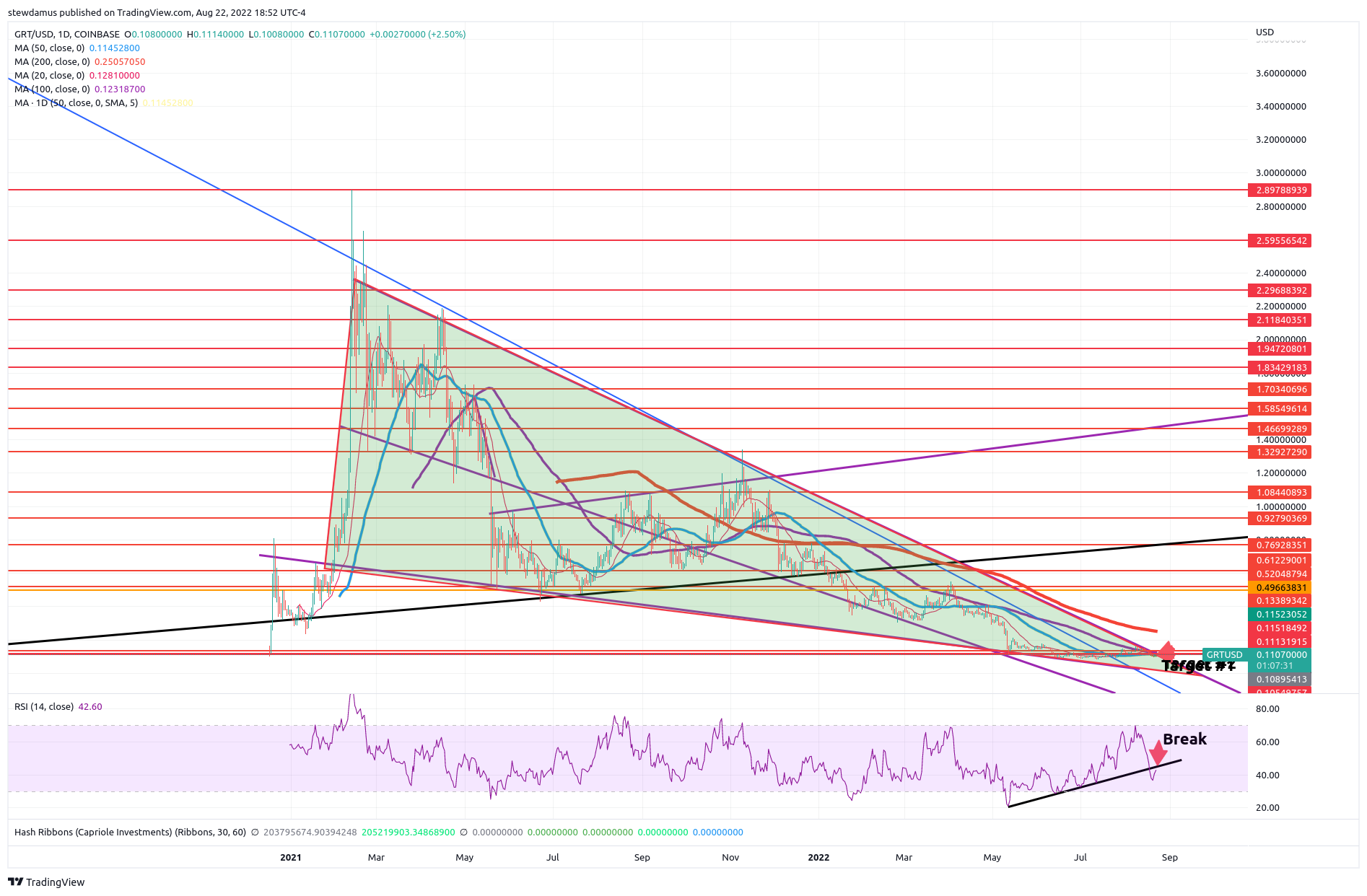 GRT look ready to break a longer term bullish descending wedge it has existed inside of for a year and 8 months. I am only going for a very short term trade here. Borderline day trade. We’ll see.