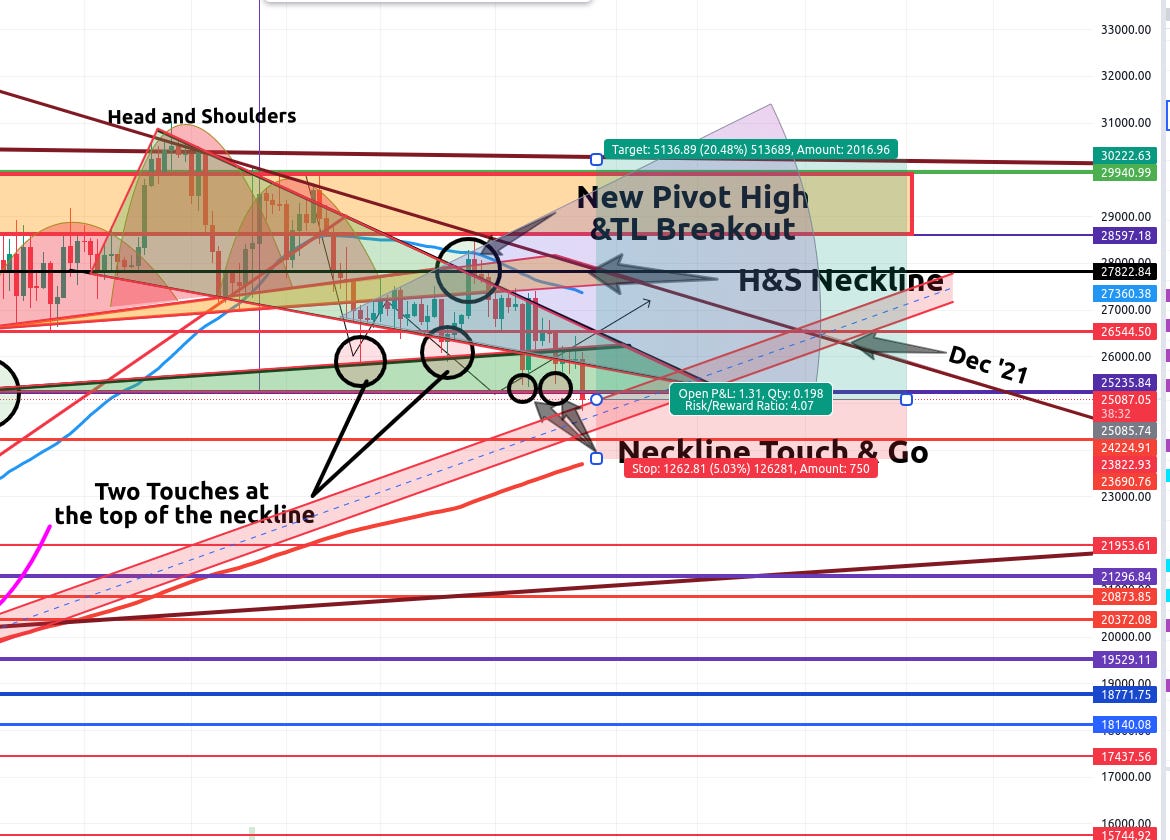 Admittedly, taking another risky trade here. But after (3) three long months of waiting, Bitcoin has finally hit my projected neckline retest and I had to take this trade: