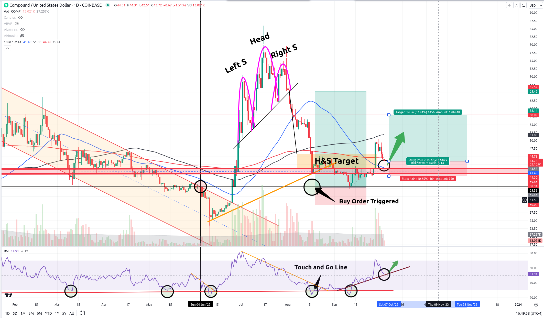 Got stopped out of my last position in COMP due to a trailing stop. Not mad tho. Ended up with 21% profit in the pockets. I hate to be out of this trade esp. since the MM's have been moving everything up during off hours. This bull flag here looks primed and prepped. Additionally, we have a hammer candle on the daily. Entry was 43.73. I'll target 58. SL will be 39 but trail upon profit as always.