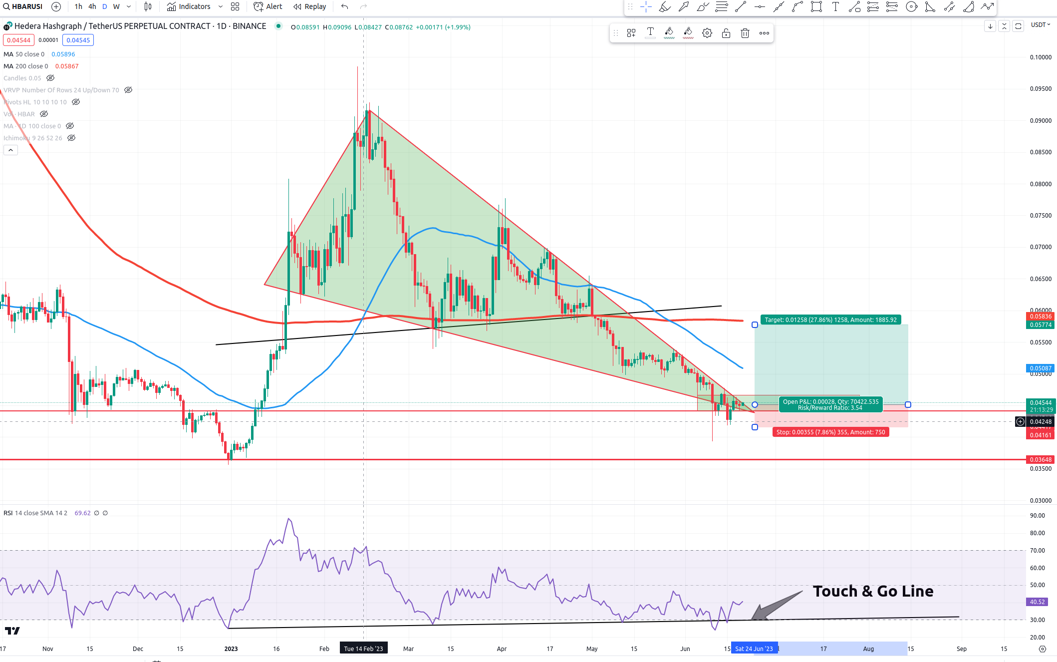 Hedera has reached the end of a bullish descending wedge which also runs into some very solid support at .044. Should this break then, yes, we’ll probably drop down to that next level at .036. But odds are in our favor here that we go up instead. I’ll be shooting for that 200 day ma which, right now, sits at .058. My stop out will be right around .0415.