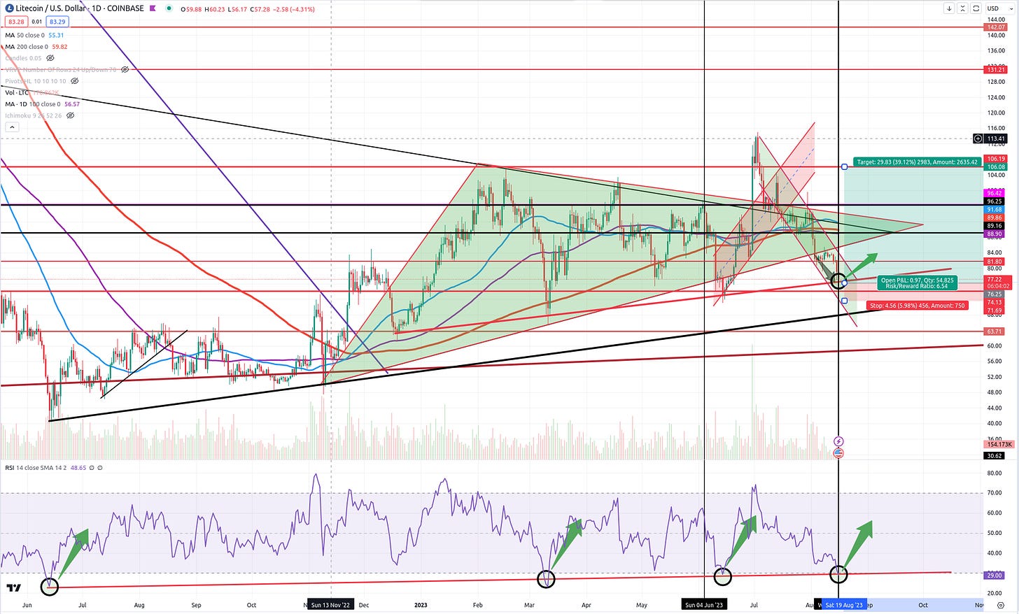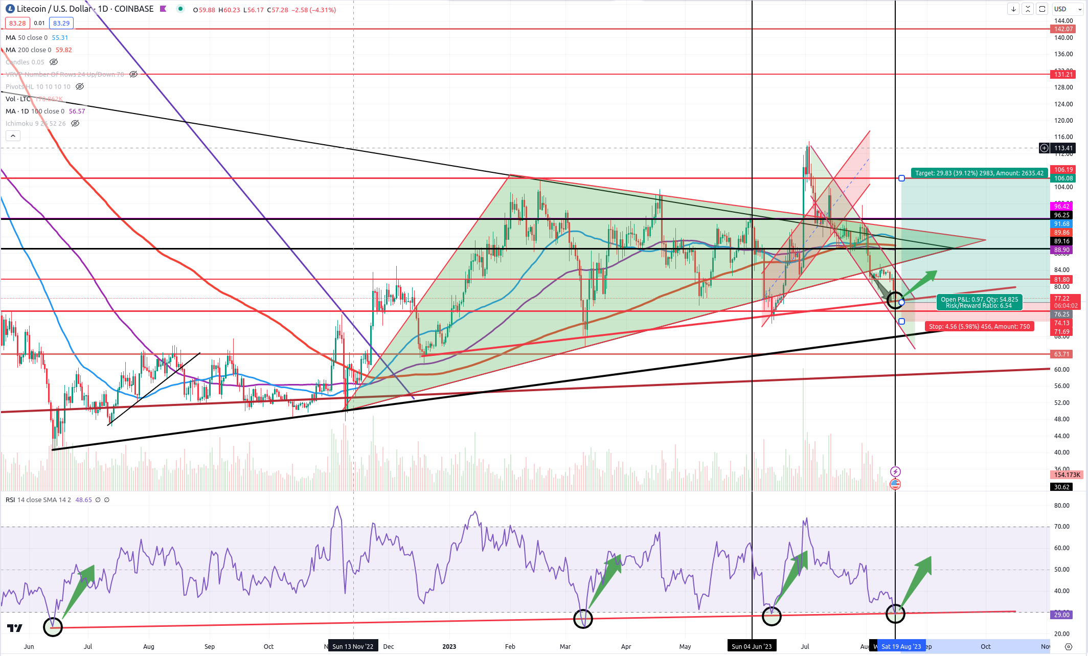 A little more on why I took this trade. Of course, fundamentally, you all probably know that halving occurred. The market sold the news and now from a technical standpoint, little Litecoin looks to be oversold. You can see on the RSI chart below that every time we hit that ascending red TL, we popped for a gain of at least 50%. Every. Time. Thus, probability here remains largely in our favor just from this one indicator.