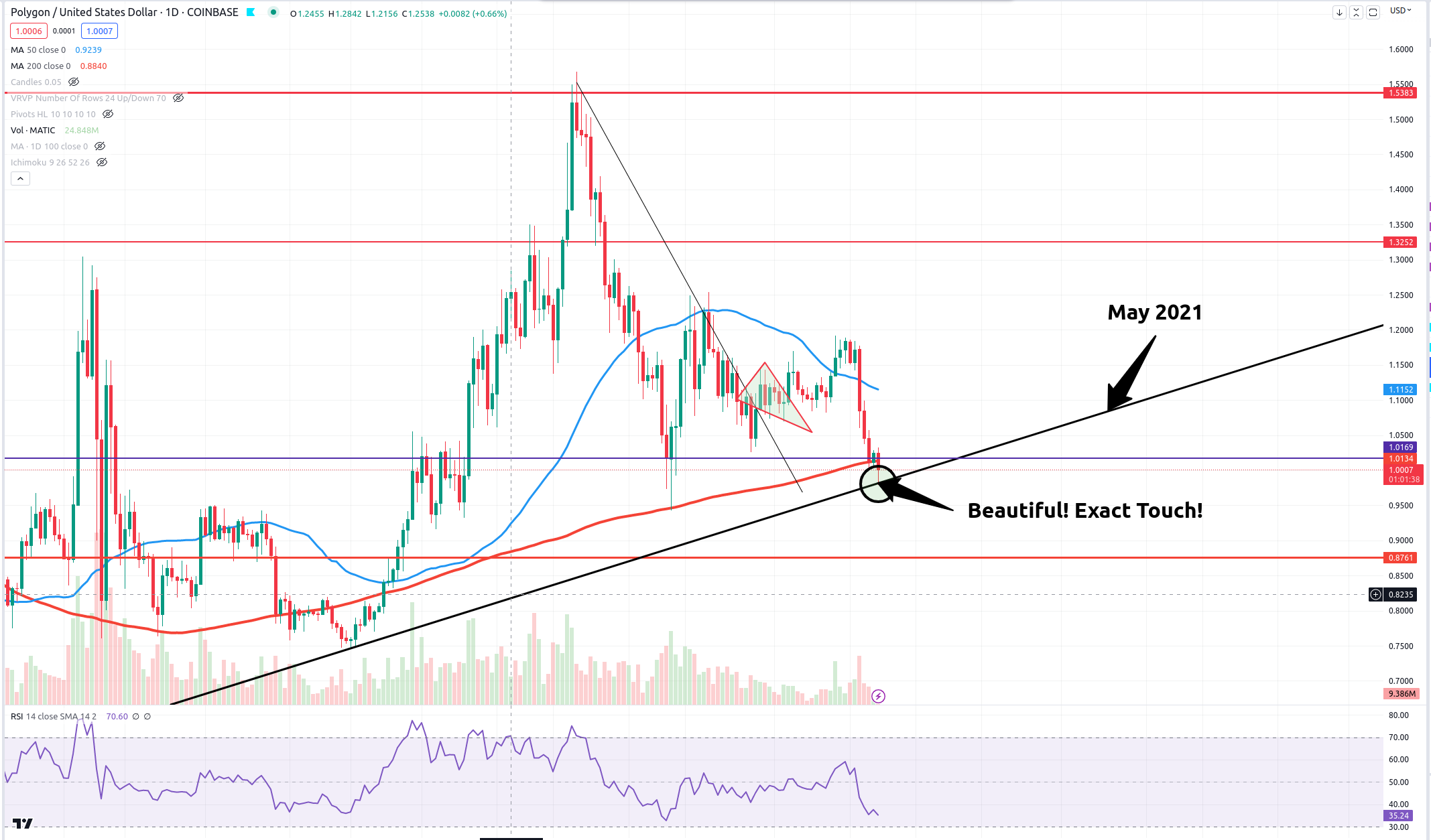 You guys know I have been dreaming of a touch on our MATIC May 2021 ascending trendline for months now. Today we got that. And though I missed the .98 cents touch for a buy in, I did get in at a dollar. My target will be at least that $1.53 cents level. Stop out is hard. But I wouldn't want to see anything much lower than that .87 cent level I have marked.