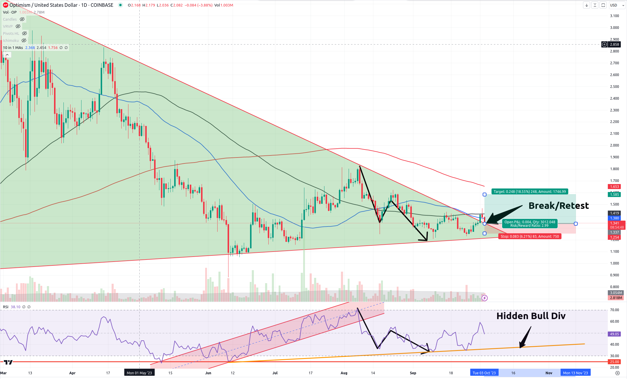 Optimism with the triangle breakout and retest is a solid entry rn. Additionally, there is some hidden bullish divergence occurring on the RSI!