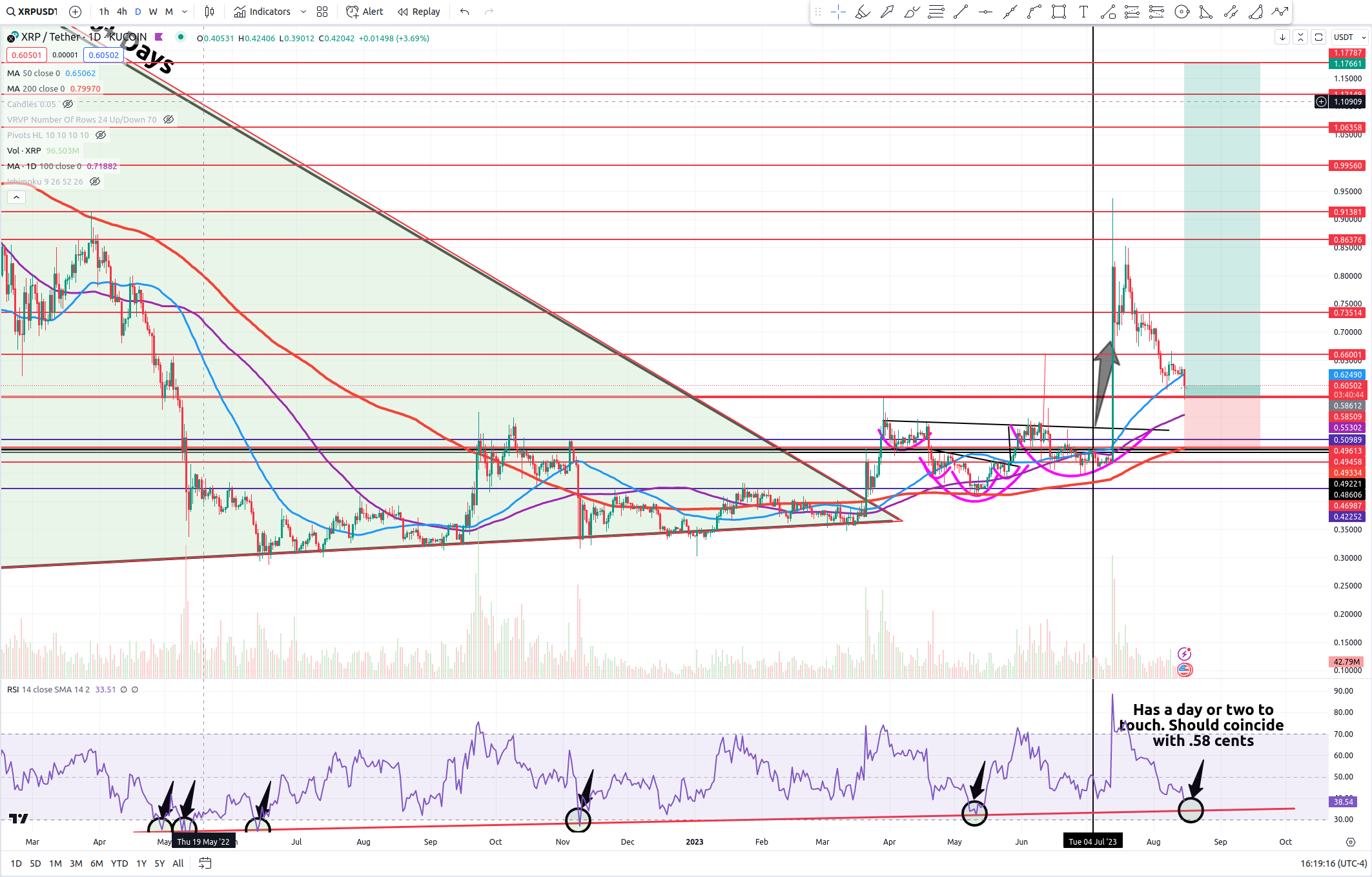 We have waited patiently for this moment. Crypto, quite honestly, has just been annoying lately. But finally, XRP has touched my support and target down for re-entry at 58 cents. My buy order was triggered at .585 to be exact and I plan to hold this to at least the .995 target and potentially $1.17.