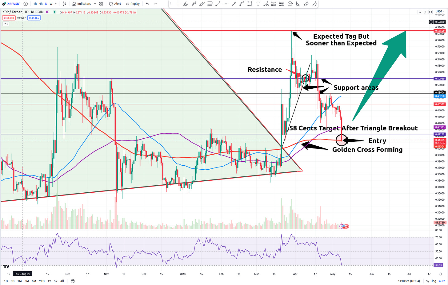 You know I have waited patiently for this one. For three weeks plus, I have set my entry area at .42 and I have remained disciplined, staying out of the trade until entry target was reached. Today that was achieved. In fact, I even got a better deal with an entry at our 200 day ma. Target depends but I am shooting for those levels above and may hold a bit to .58 cents again. Stop out will be around .37 cents, again pending price action. We’re batting 100% so far on XRP. Let’s keep it going and make it 7/7 wins!